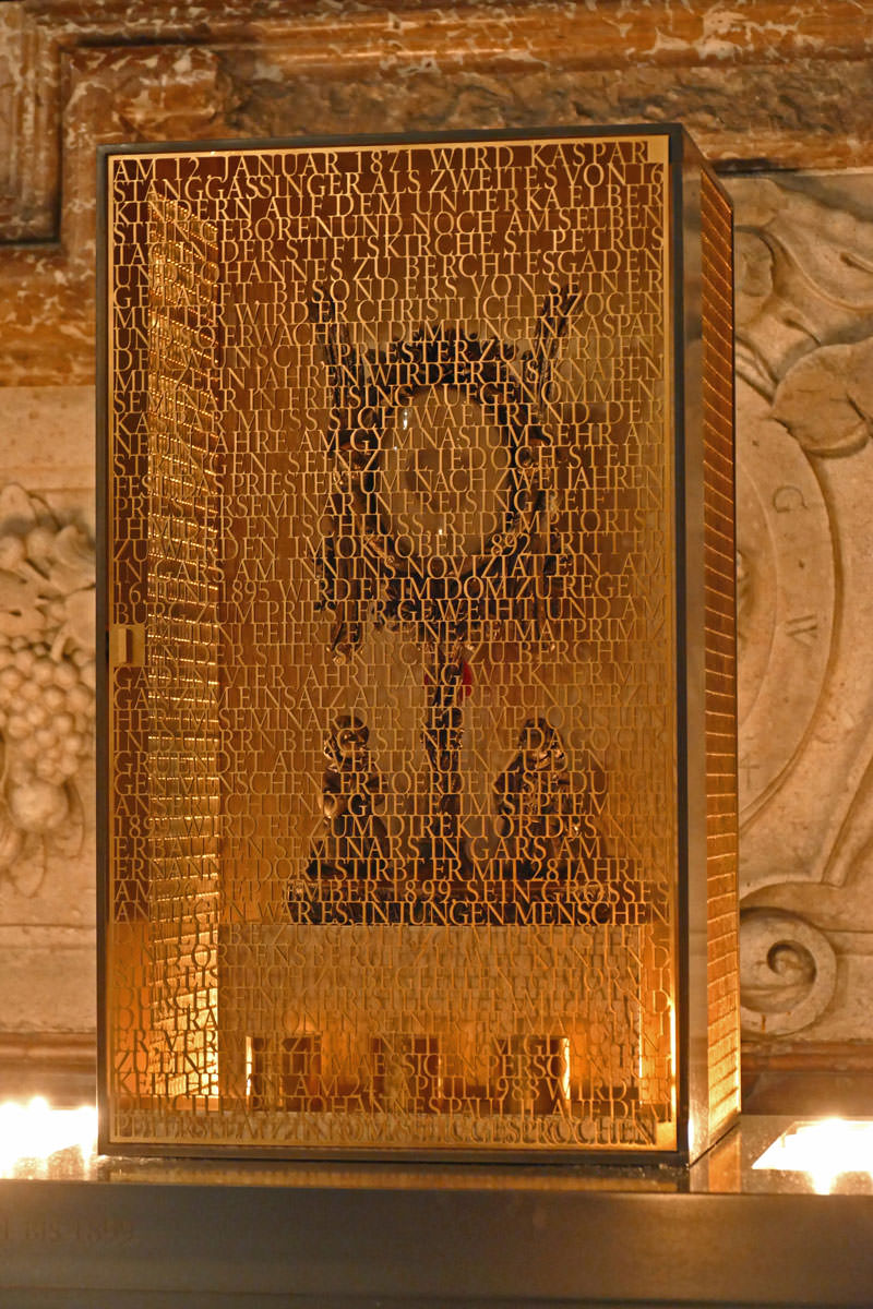 Aus den Buchstaben der Vita des seligen Kaspar Stanggassinger ist die Türe des Schreins geformt, sie geben ihr gleichzeitig Transparenz und Halt. Durch das Leben blickt man auf seine Reliquie und durch sein Leben hindurch scheint göttliches Licht in die Welt – der eigentliche Sinn von Heiligkeit.