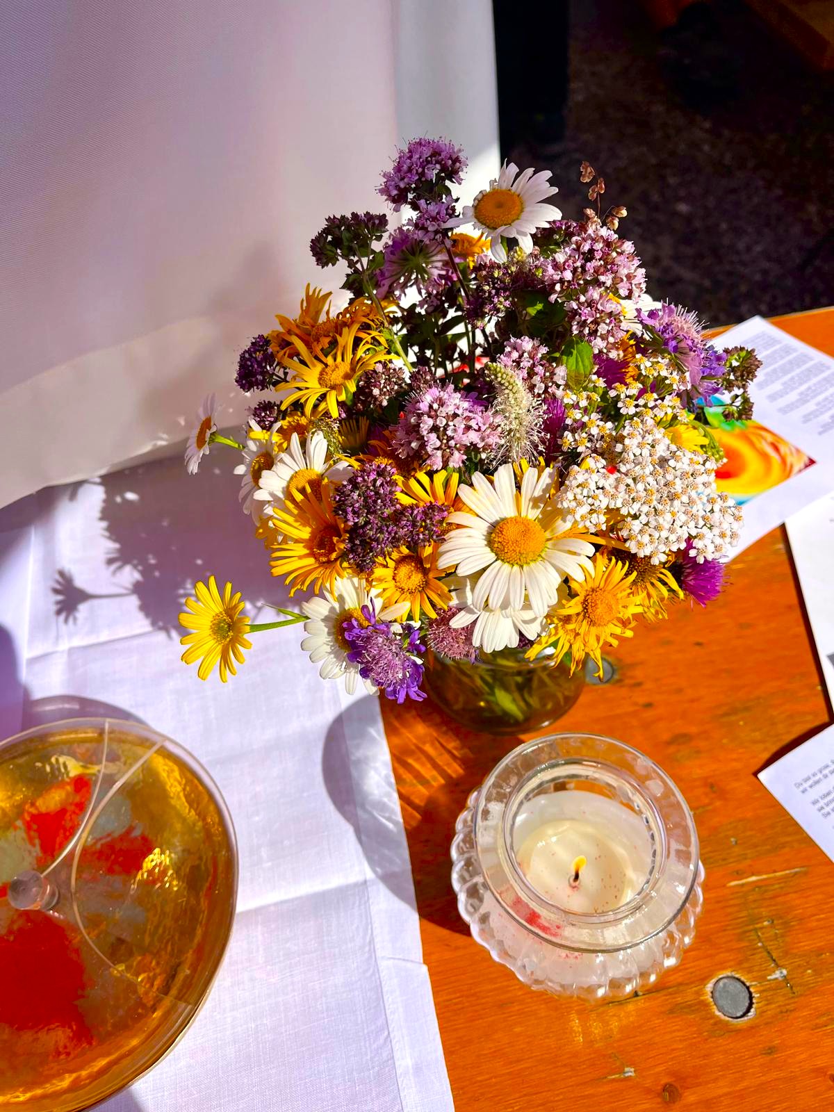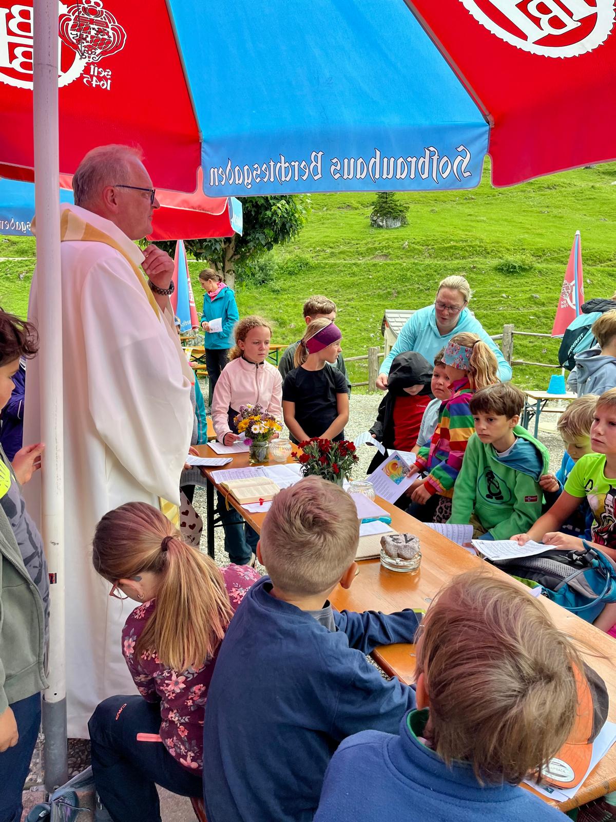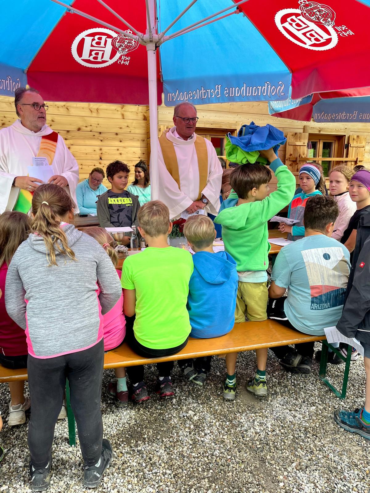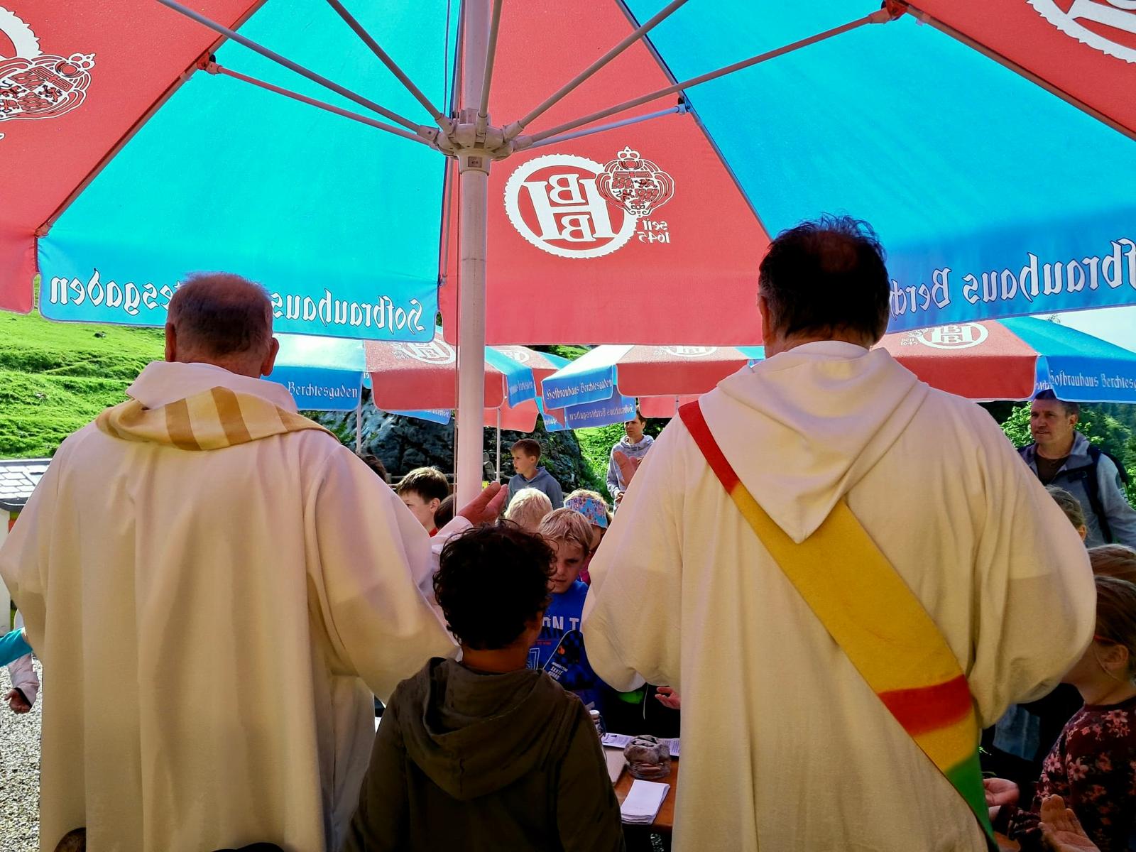 Nachdem sich alle um Pfarrer Thomas Frauenlob und Diakon Michael König zum Gottesdienst versammelt hatten, die Kinder den Altar mit einem Almblumenstrauß und Kerzen geschmückt hatten, kam ein kurzer Regenschauer.