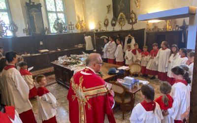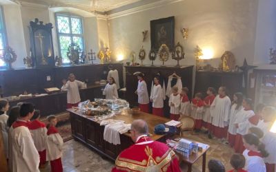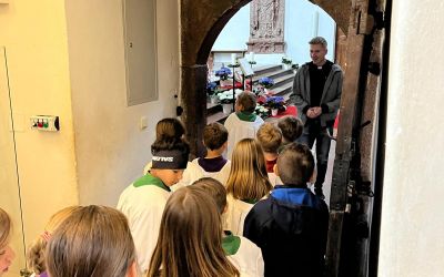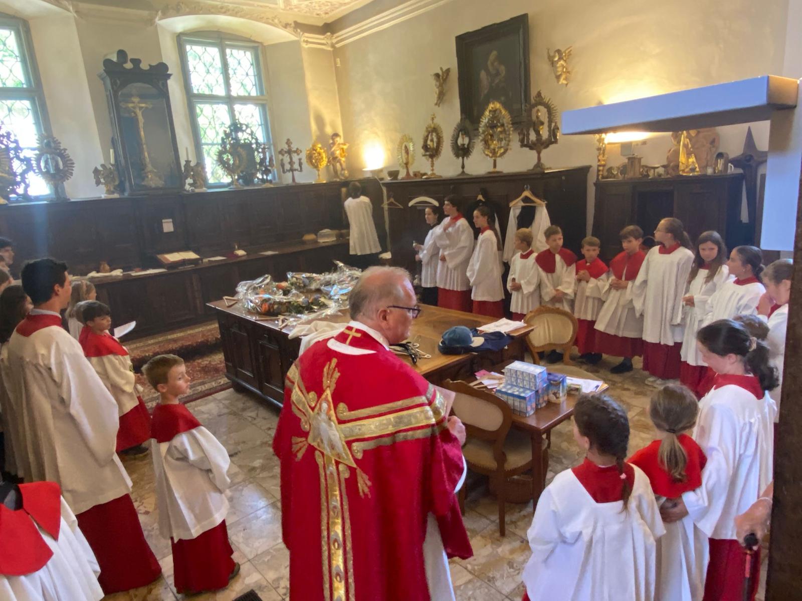 Jedes Jahr gibt es nach der Erstkommunion in unseren Pfarreien des Pfarrverbandes das Angebot Ministrant/ in zu werden. In diesem Jahr wurden zum Kennenlernen des Messdiener-Dienstes und welche Aufgaben damit verbunden sind, in der Stiftskirche kleine Kennenlern-Erlebnis-Workshops angeboten. Die Kinder lernten dabei auf spannende Weise die Sakristei und ihr Inventar kennen. Pfarrer Frauenlob und Pater Fidelis erklärten den Kindern die Bedeutung der Messgewänder mit ihren Farben im Kirchenjahr, die liturgischen Gegenstände wurden näher betrachtet und deren Bedeutung für den Gottesdienst in kindgerechter Weise den Kindern erklärt. Dann ging man in die Obersakristei, dort durften sich alle Kinder Ministrantengewänder anprobieren und anziehen. Der Workshop stand unter dem Motto: „Learning by doing“ und die Kinder hatten große Freude dabei. Es war gar nicht so einfach, die richtige Größe zu finden, kombiniert mit der richtigen Farbe. Aber letztendlich hatte jedes Kind sein Ministrantengewand gefunden und angezogen. Jetzt war die Sache schon interessanter, denn alle sahen wir richtige Ministranten aus und nun konnte man in den Praxisteil übergehen. Jetzt ging es ans Üben.