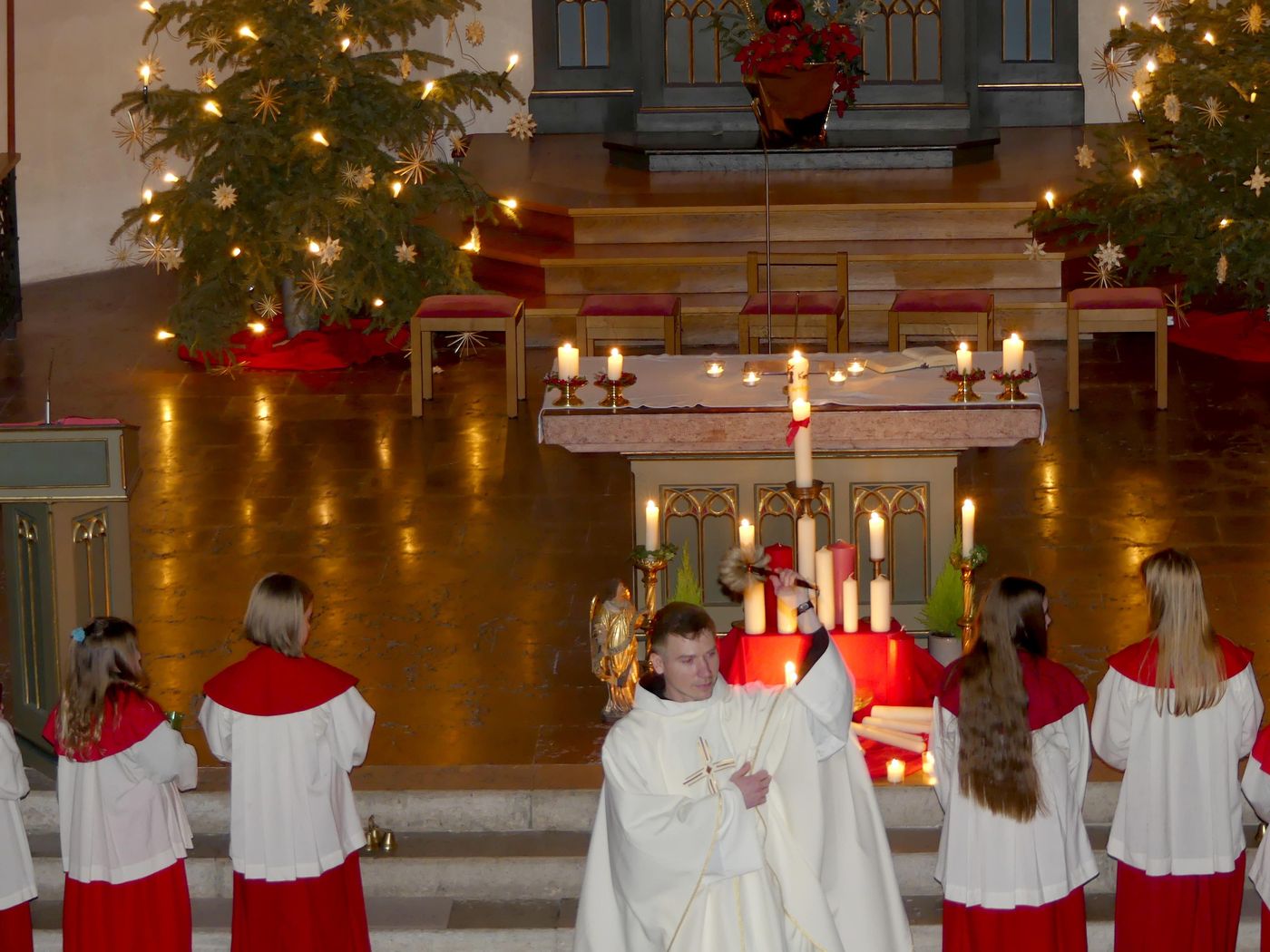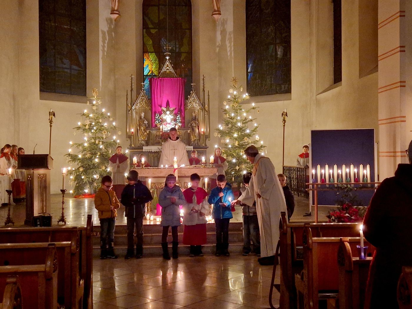 Nach der Kerzensegnung wurden noch in der Kirche die Kerzen der Gläubigen mit Unterstützung der Ministrantinnen entzündet. Dann formierte sich der Zug und bewegte sich um den oberen Markt, um dann wieder in das Gotteshaus einzuziehen. Dort wurde gemeinsam der Festgottesdienst gefeiert. Vorne in der ersten Bank hatten die diesjährigen Kommunion-kinder Platz genommen, die die geweihten Kommunionskerzen in Empfang nehmen konnten, um sie später persönlich nach ihrem Geschmack zu verzieren und um sie am Tage der Erstkommunion zu dem hohen Ereignis zu tragen..