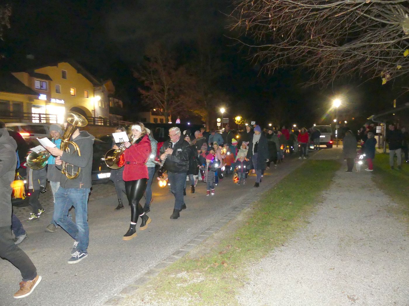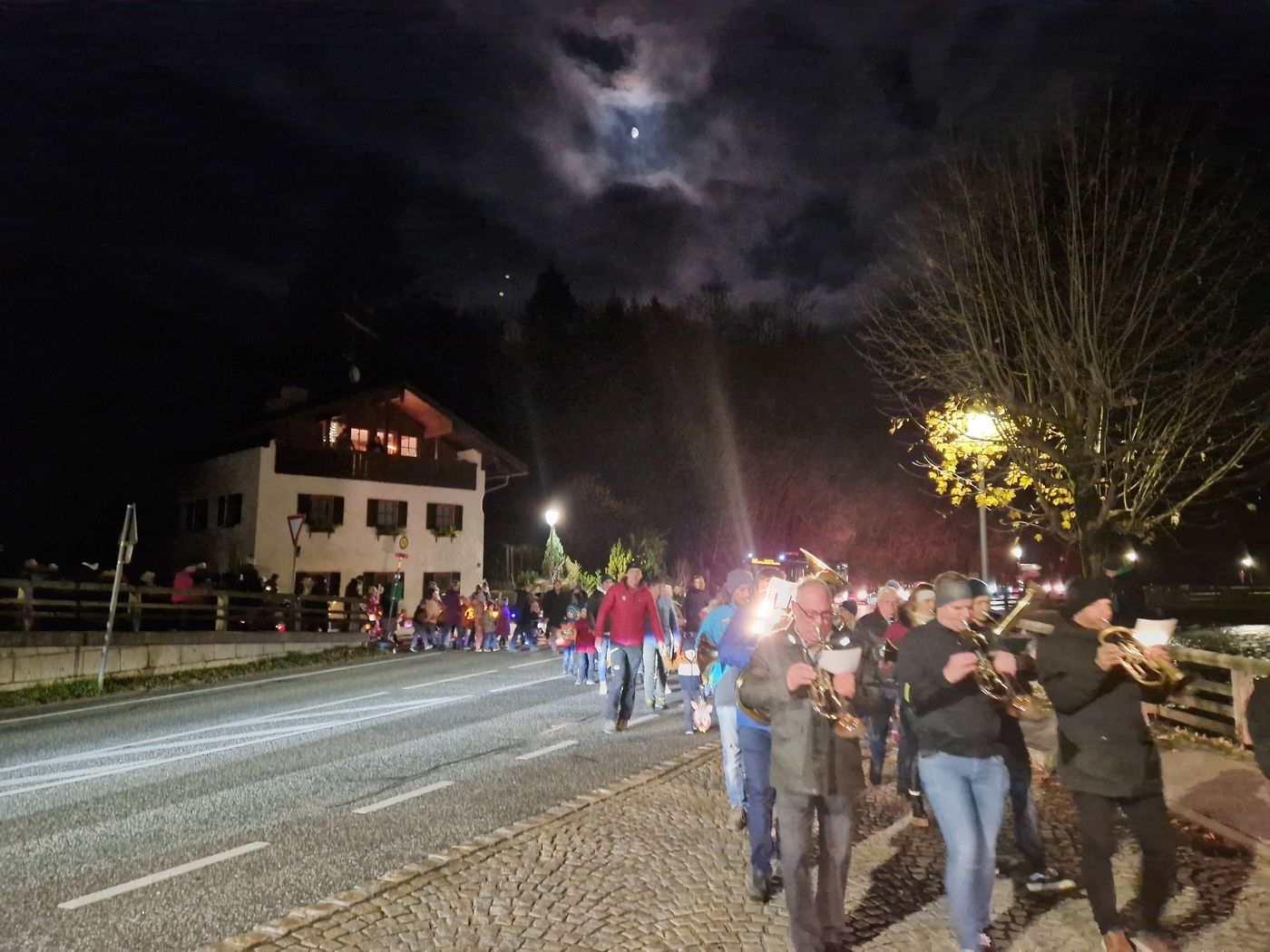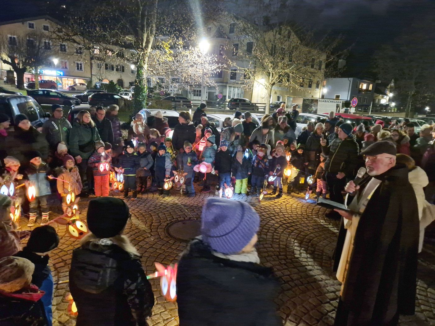 Organist und Kirchenchorleiter Adrian Suciu begleitete mit seinem Keyboard und Schuldirektorin Michaela Hennecke mit ihrer Gitarre den Gesang zu den Liedern, die die Kinder in der Schule eingeübt hatten. An der langsam aufkommenden Unruhe der Kinder erkannte man, dass sie sich schon auf den bevorstehenden Laternenumzug freuten, damit sie ihre kunstvollen Laternen endlich zum Leuchten bringen konnten. So rief dann Franziskanerpater Manfred Gruber zur Aufstellung zum Laternenumzug auf, der von der Musikkapelle Marktschellenberg angeführt wurde Es ging zunächst von der Kirchgasse hinunter zum ehem. Gasthaus Forelle, dort vorbei und überquerte die Bundesstraße, die von Mitgliedern der FFW abgesichert wurde, in den Park am Info-Point. Dort waren bereits die Hütten für den Adventsmarkt aufgebaut, wo für das leibliche Wohl gesorgt war und Würstelsemmeln, Kinderpunsch und auch Glühwein (für die Erwachsenen) angeboten wurden. Zuvor aber beschloss Pater Manfred die Veranstaltung mit dem Schlusssegen und wünschte Allen einen gesegneten Abend.