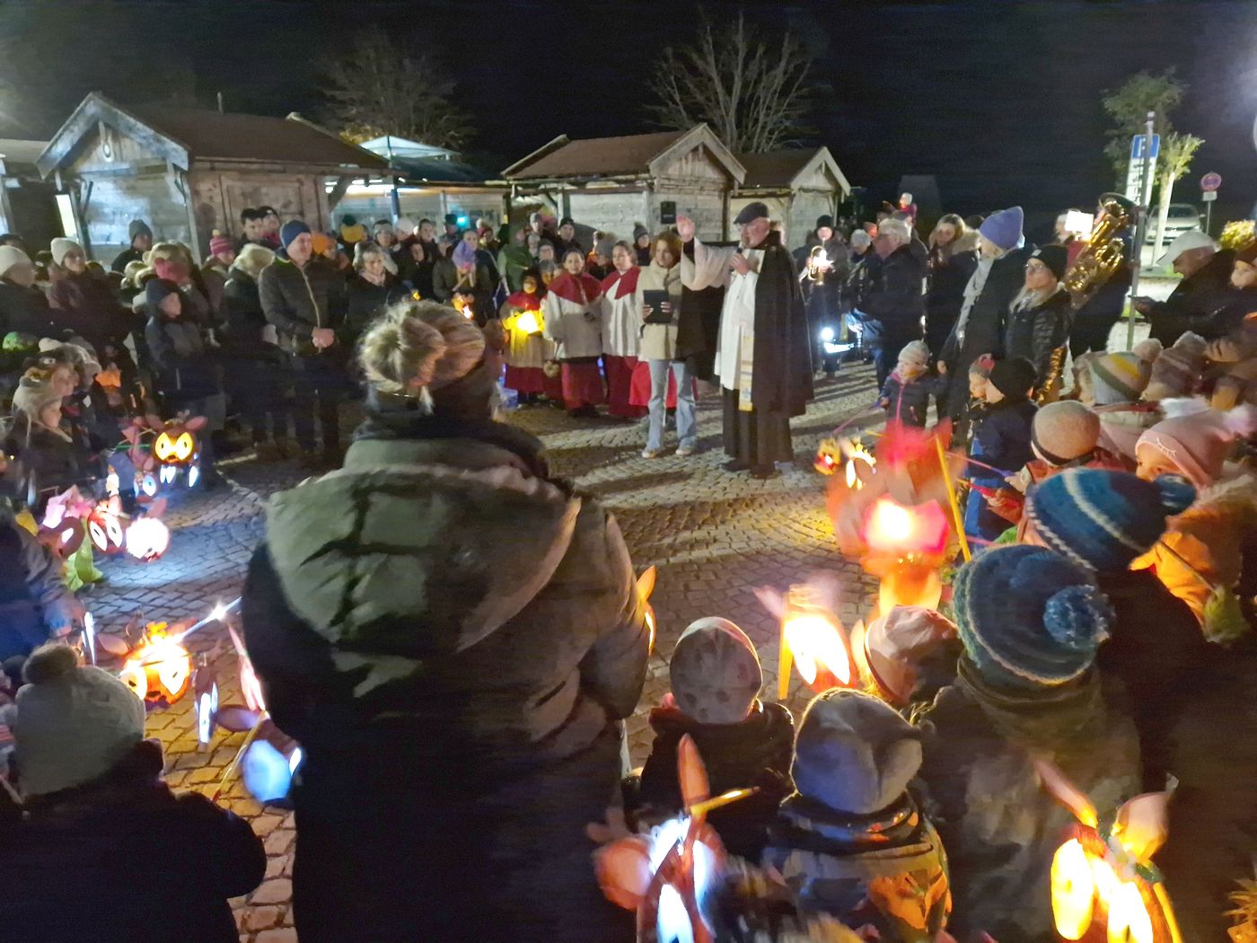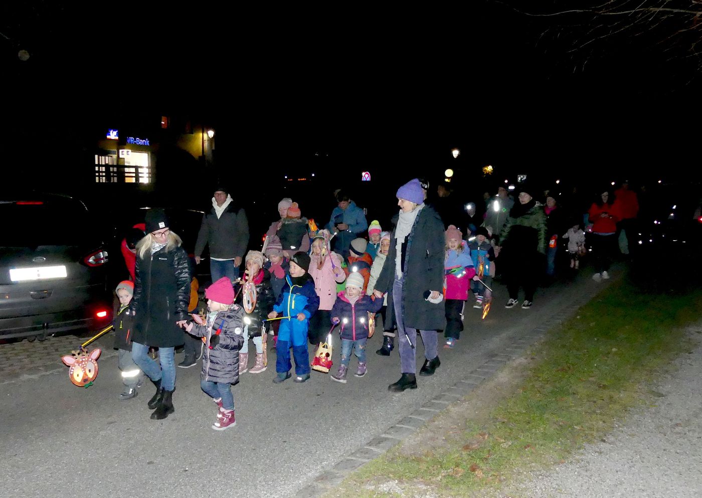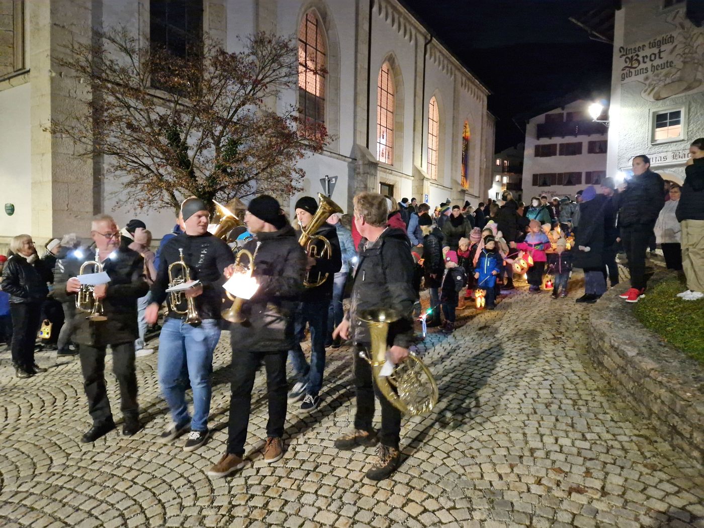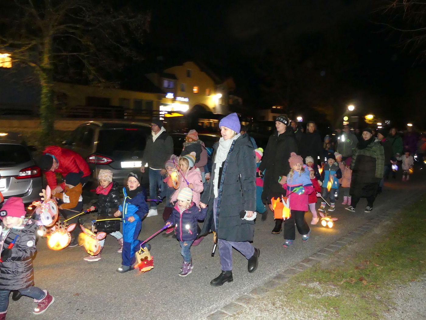 Organist und Kirchenchorleiter Adrian Suciu begleitete mit seinem Keyboard und Schuldirektorin Michaela Hennecke mit ihrer Gitarre den Gesang zu den Liedern, die die Kinder in der Schule eingeübt hatten. An der langsam aufkommenden Unruhe der Kinder erkannte man, dass sie sich schon auf den bevorstehenden Laternenumzug freuten, damit sie ihre kunstvollen Laternen endlich zum Leuchten bringen konnten. So rief dann Franziskanerpater Manfred Gruber zur Aufstellung zum Laternenumzug auf, der von der Musikkapelle Marktschellenberg angeführt wurde Es ging zunächst von der Kirchgasse hinunter zum ehem. Gasthaus Forelle, dort vorbei und überquerte die Bundesstraße, die von Mitgliedern der FFW abgesichert wurde, in den Park am Info-Point. Dort waren bereits die Hütten für den Adventsmarkt aufgebaut, wo für das leibliche Wohl gesorgt war und Würstelsemmeln, Kinderpunsch und auch Glühwein (für die Erwachsenen) angeboten wurden. Zuvor aber beschloss Pater Manfred die Veranstaltung mit dem Schlusssegen und wünschte Allen einen gesegneten Abend.