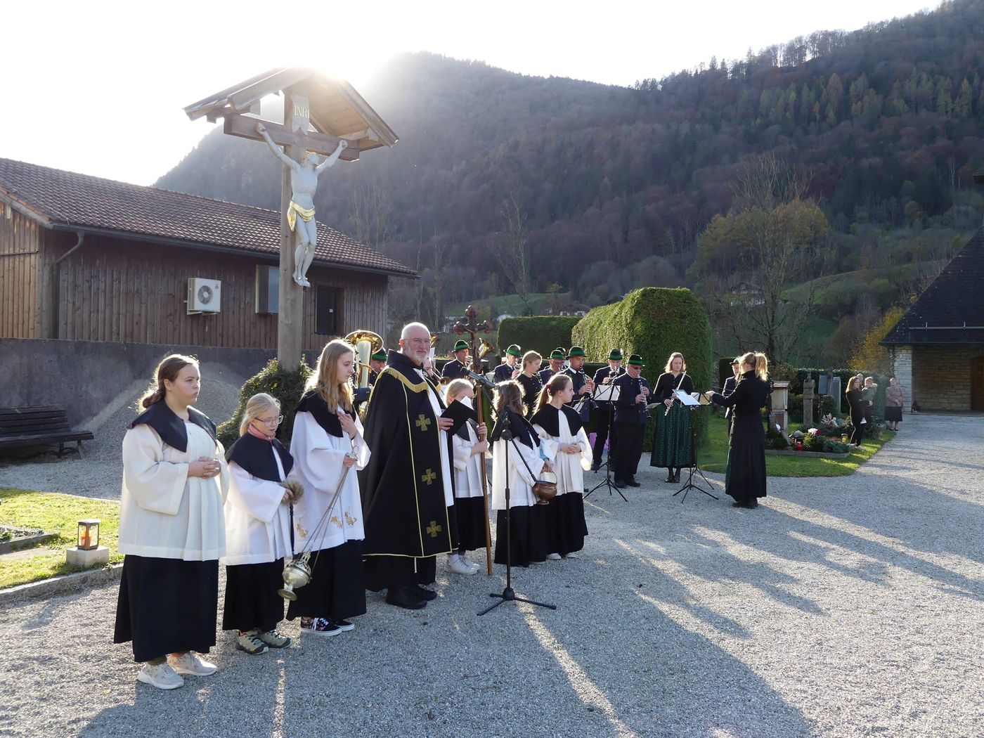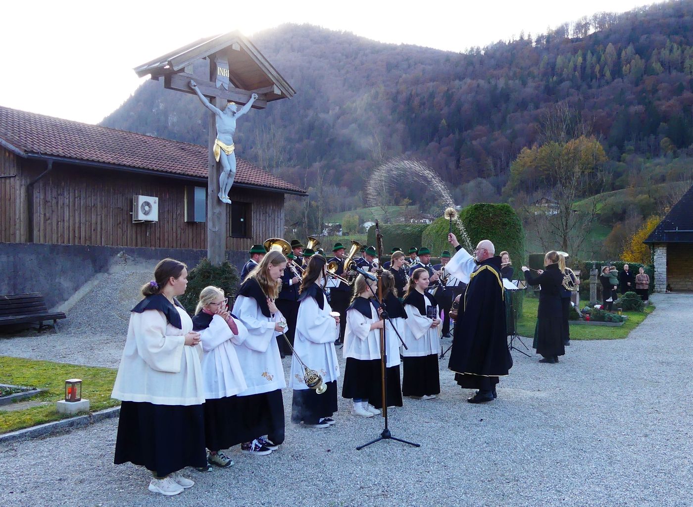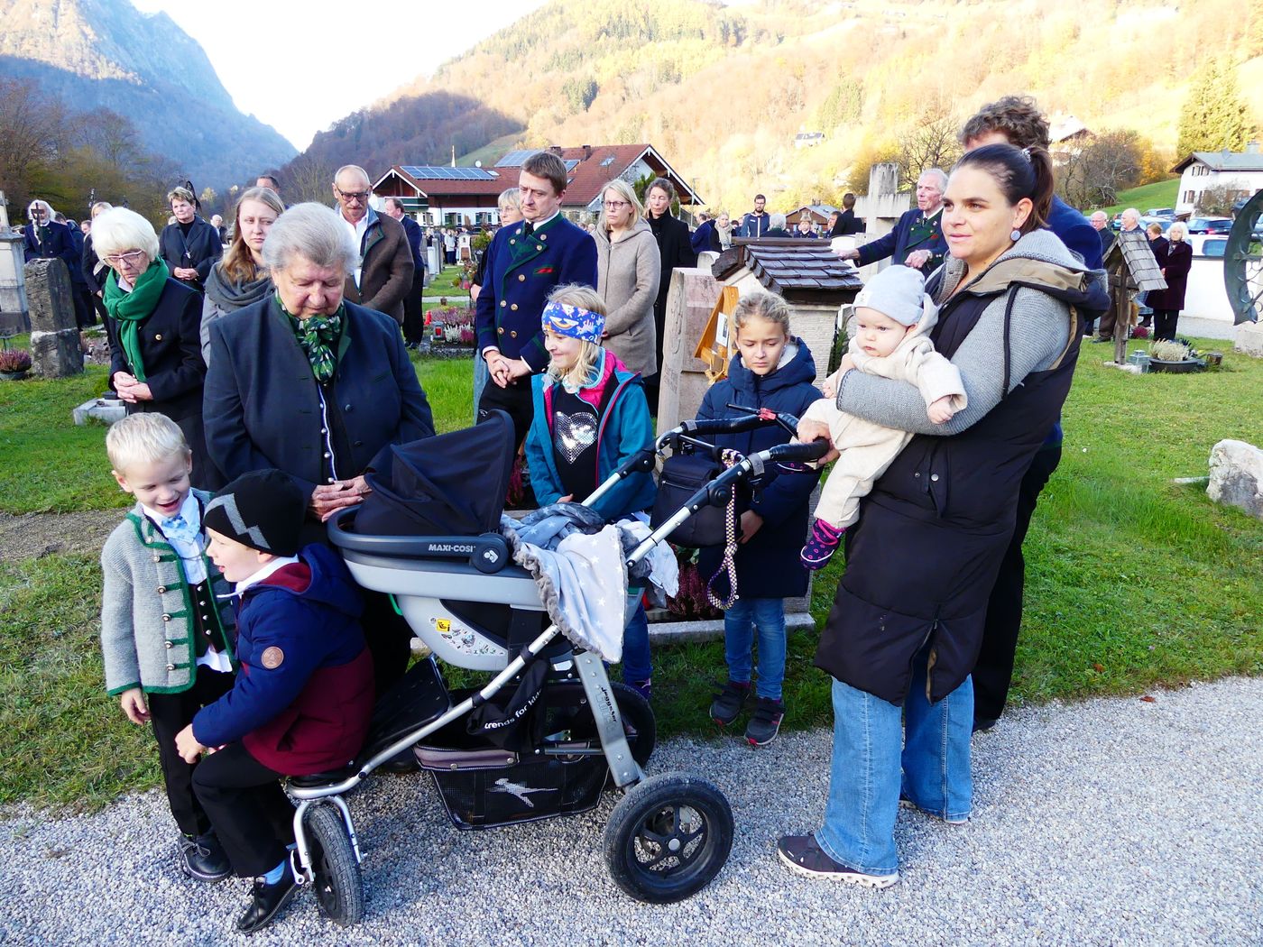 Die traditionelle Gräbersegnung mit Weihwasser und Weihrauch wurde von der Musikkapelle Marktschellenberg unter der Stabführung der Franziska Aschauer musikalisch umrahmt. Nach der Gräbersegnung erklang das Lied vom guten Kameraden, das von 3 Salutschüssen des Weihnachtsschützenvereins Götschen-Schellenberg begleitet wurde. Zum Abschluss bedankte sich Pater Manfred bei Allen, die zur Organisation des Festtages beigetragen hatten und entließ die Gläubigen mit allen guten Wünschen für den Rest des Feiertages und so manch einer nutzte nach dem Friedhofsbesuch die Gelegenheit zu einem Gespräch mit Bekannten, die man schon lange nicht mehr gesehen hatte.