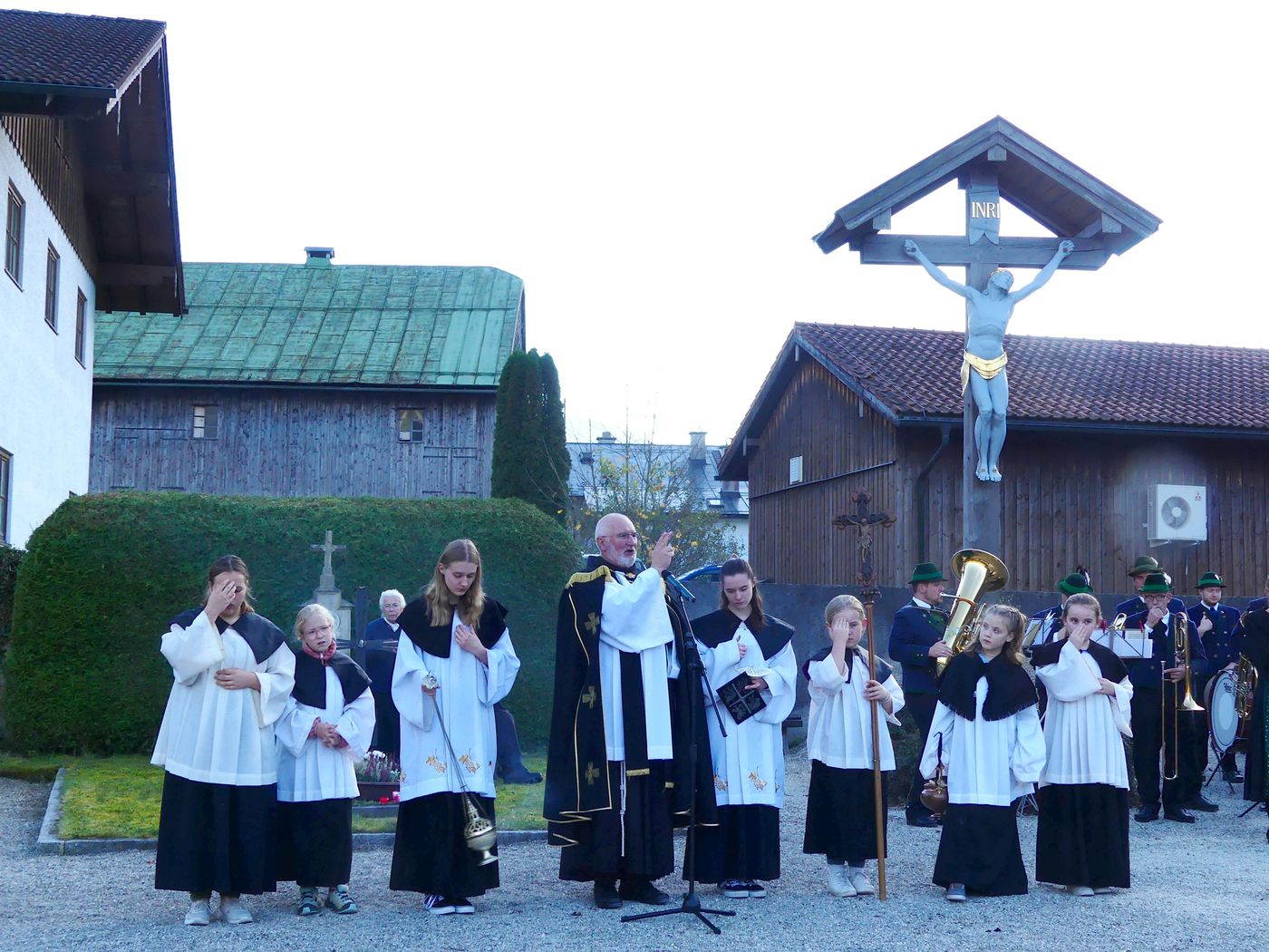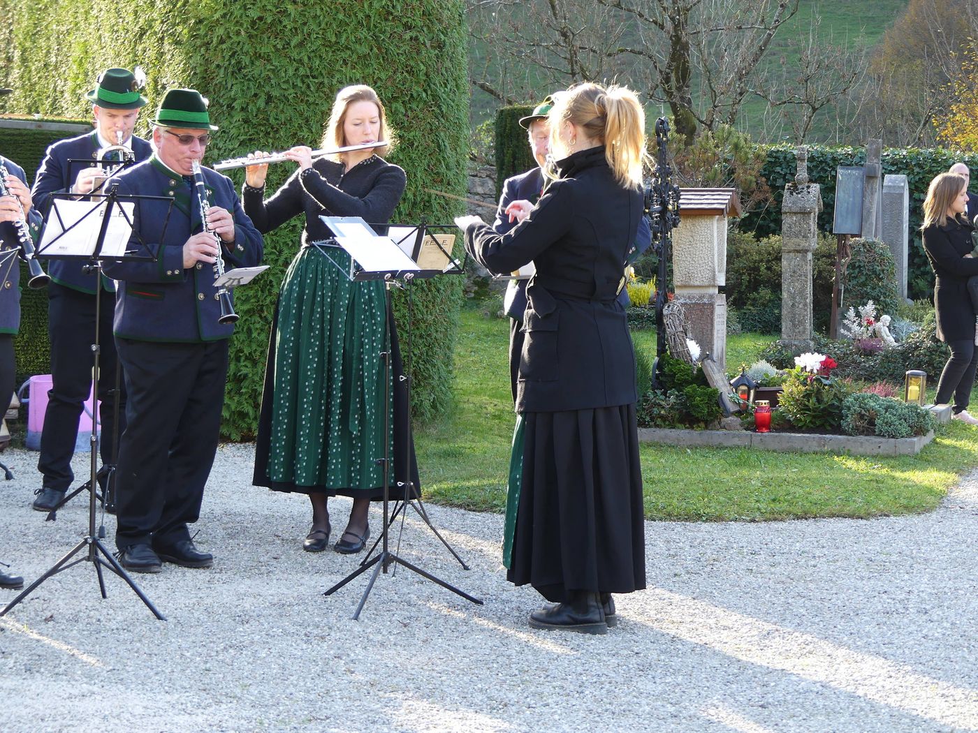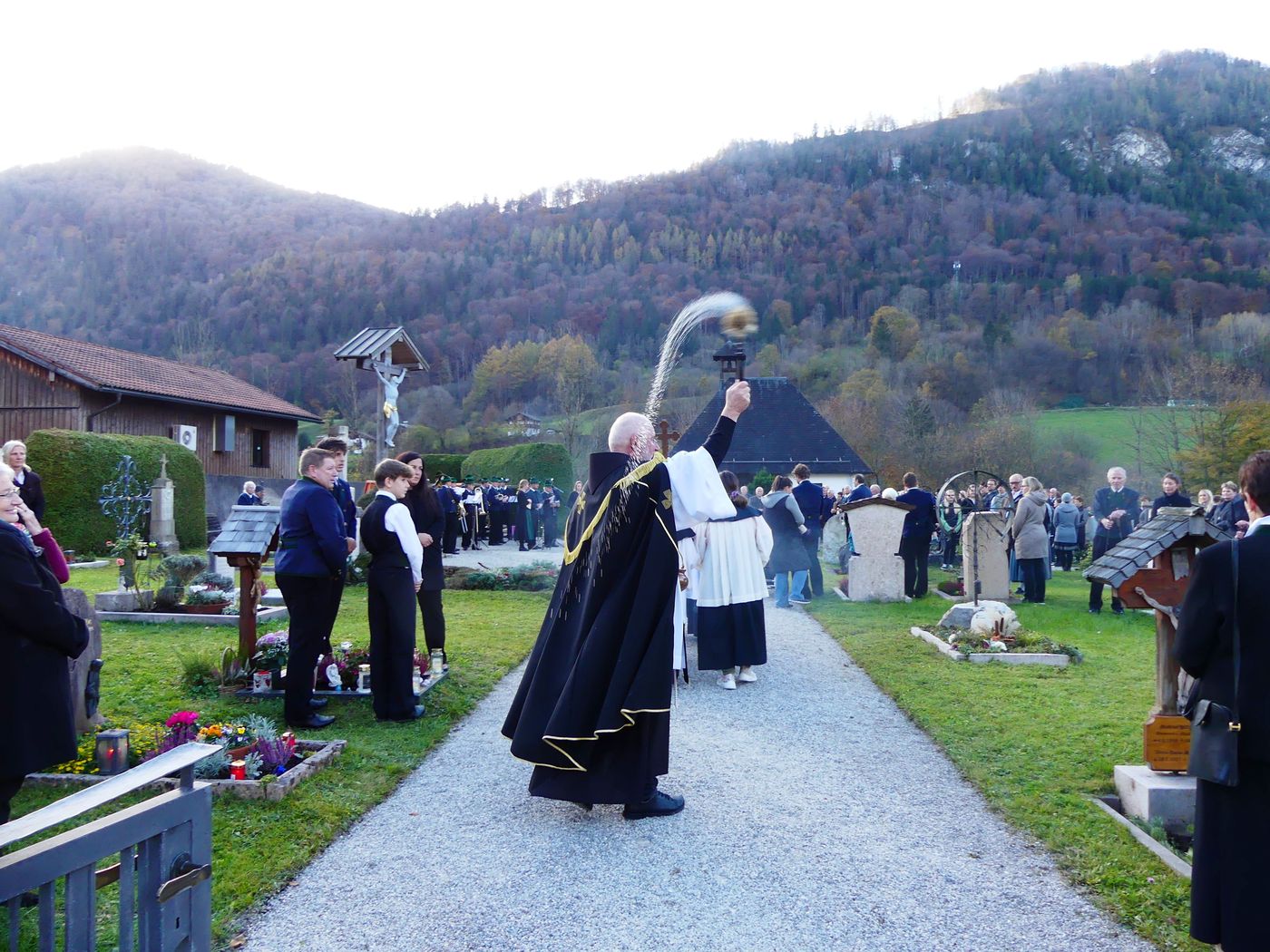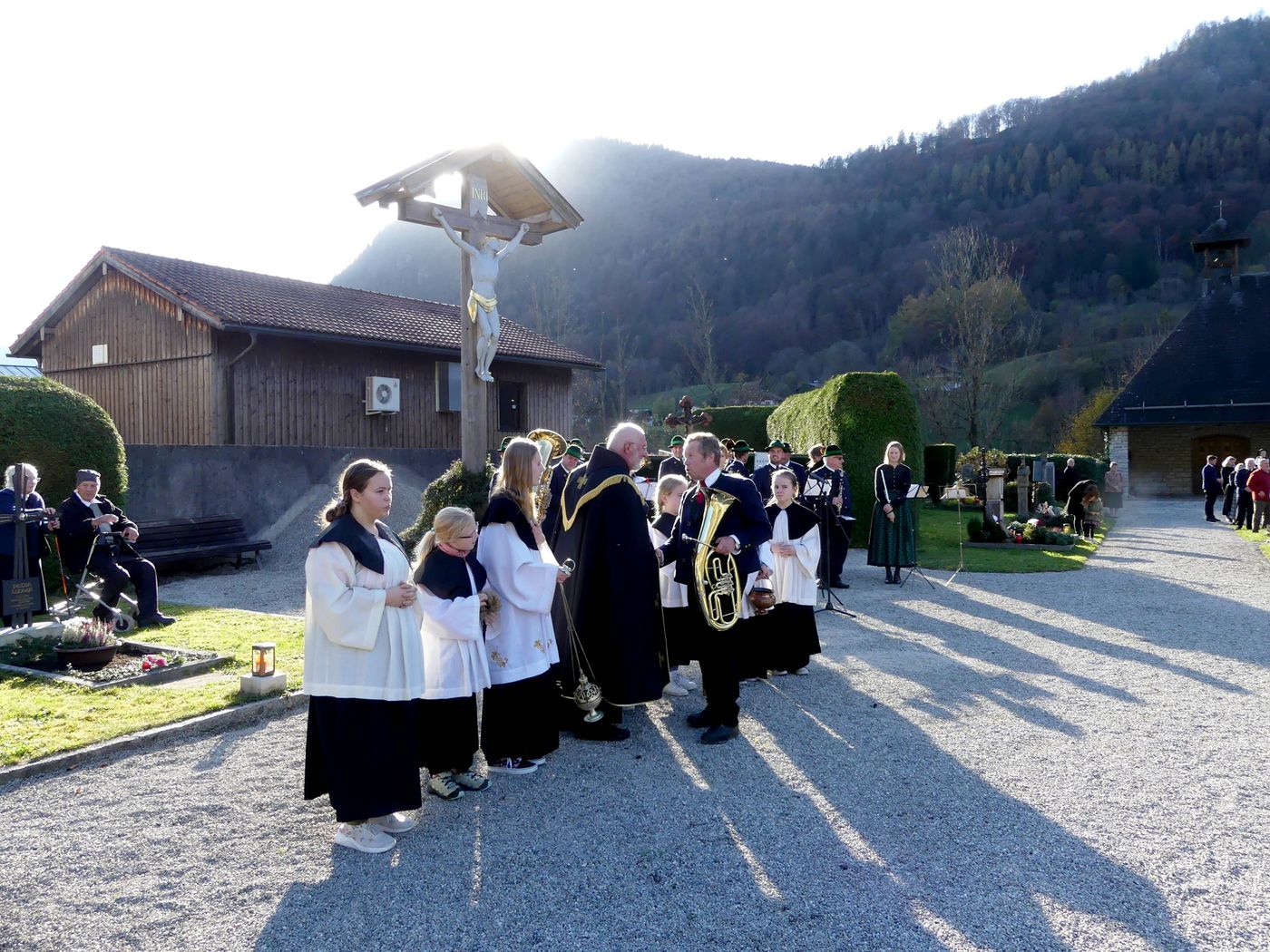 Die traditionelle Gräbersegnung mit Weihwasser und Weihrauch wurde von der Musikkapelle Marktschellenberg unter der Stabführung der Franziska Aschauer musikalisch umrahmt. Nach der Gräbersegnung erklang das Lied vom guten Kameraden, das von 3 Salutschüssen des Weihnachtsschützenvereins Götschen-Schellenberg begleitet wurde. Zum Abschluss bedankte sich Pater Manfred bei Allen, die zur Organisation des Festtages beigetragen hatten und entließ die Gläubigen mit allen guten Wünschen für den Rest des Feiertages und so manch einer nutzte nach dem Friedhofsbesuch die Gelegenheit zu einem Gespräch mit Bekannten, die man schon lange nicht mehr gesehen hatte.