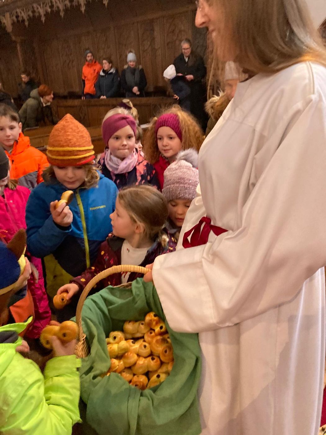Nach dem Segen zog dann „Lucia“ mit einem weißen Kleid mit rotem Gürtel und dem brennenden Kerzenkranz von hinten in die Stiftskirche hinein und nicht nur die Kinder staunten sehr. Sie hatte auch einen Korb dabei, so wie es in der Legende beschrieben steht. Die verkleidete Lucia erzählte im Gottesdienst, dass sie das Licht von Jesus zu allen heute bringen möchte und die Herzen aller Menschen im Gottesdienst damit erleuchten möchte. Sie erzählte auch, dass sie allen Freude schenken möchte, deshalb hat sie einen Korb mit den Lysekatter-Lucia-Broten dabei, die in Schweden immer am Lucia-Tag verschenkt und gegessen werden. Lucia erzählte „Und durch das gemeinsame Teilen der Lucia-Brote, wollen auch wir einander Liebe schenken. Denn mit unserer Liebe kann die Welt ein wenig friedlicher werden, das ist unsere Hoffnung.“ Die Kinder ließen sich das Safrangebäck schmecken und teilten es miteinander, so wie Lucia damals vor vielen hundert Jahren mit den verfolgten Christen Licht, Liebe, Wärme und Freude geteilt hat.