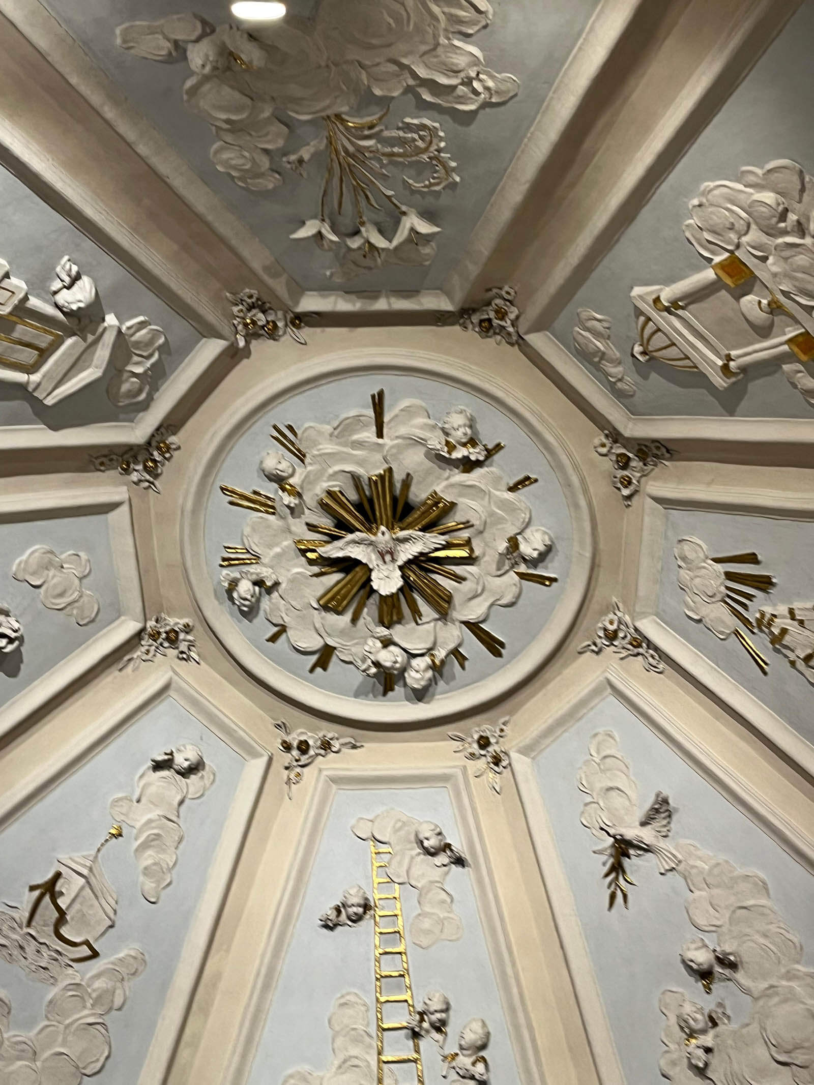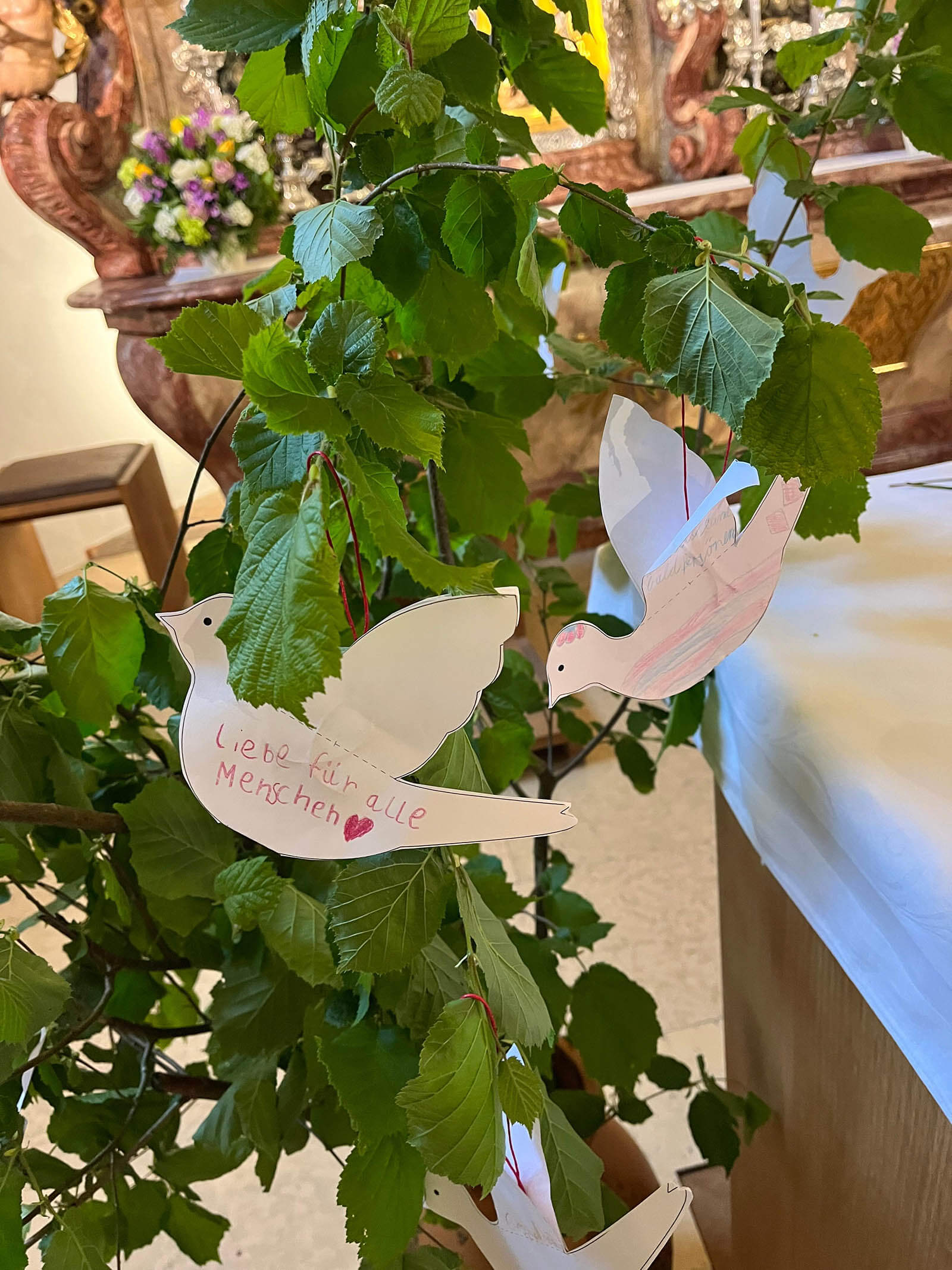 Danach durften die Kinder ihre Gegenstände dazulegen, die sie unterwegs gesammelt hatten, Herz, Krone und Blume und kurz erzählen, was sie bedeuten. Er erinnerte alle nochmal kurz daran, weshalb man sich auf den Weg zu dieser Wallfahrt gemacht habe, nämlich um Maria für den Frieden zu bitten. Anschließend beteten alle gemeinsam ein Friedensgebet zu Maria, der Königin des Friedens. Hier ein kleiner Auszug:“ Liebe Maria, Königin des Friedens, bitte hilf uns, freundlich und liebevoll zueinander zu sein. Schenke uns Frieden in unseren Herzen und in die Welt. Maria bitte bete für uns, damit wir immer friedlich miteinander leben….“. Nach einem gemeinsamen Friedenslied duften alle ihre Friedenstauben an Zweigen neben dem Altar hängen und wer mochte, durfte seinen Friedenswunsch laut vorlesen.
