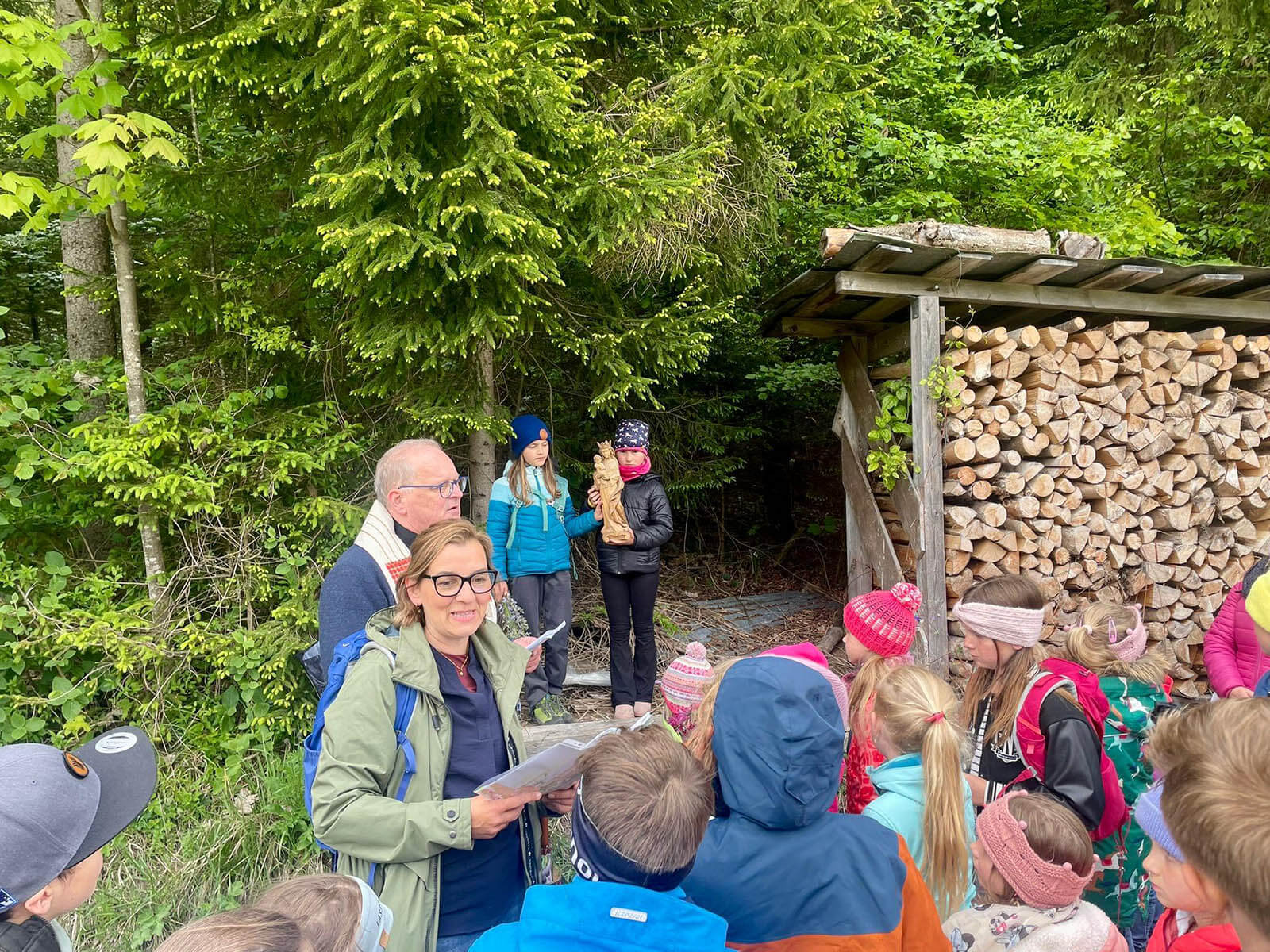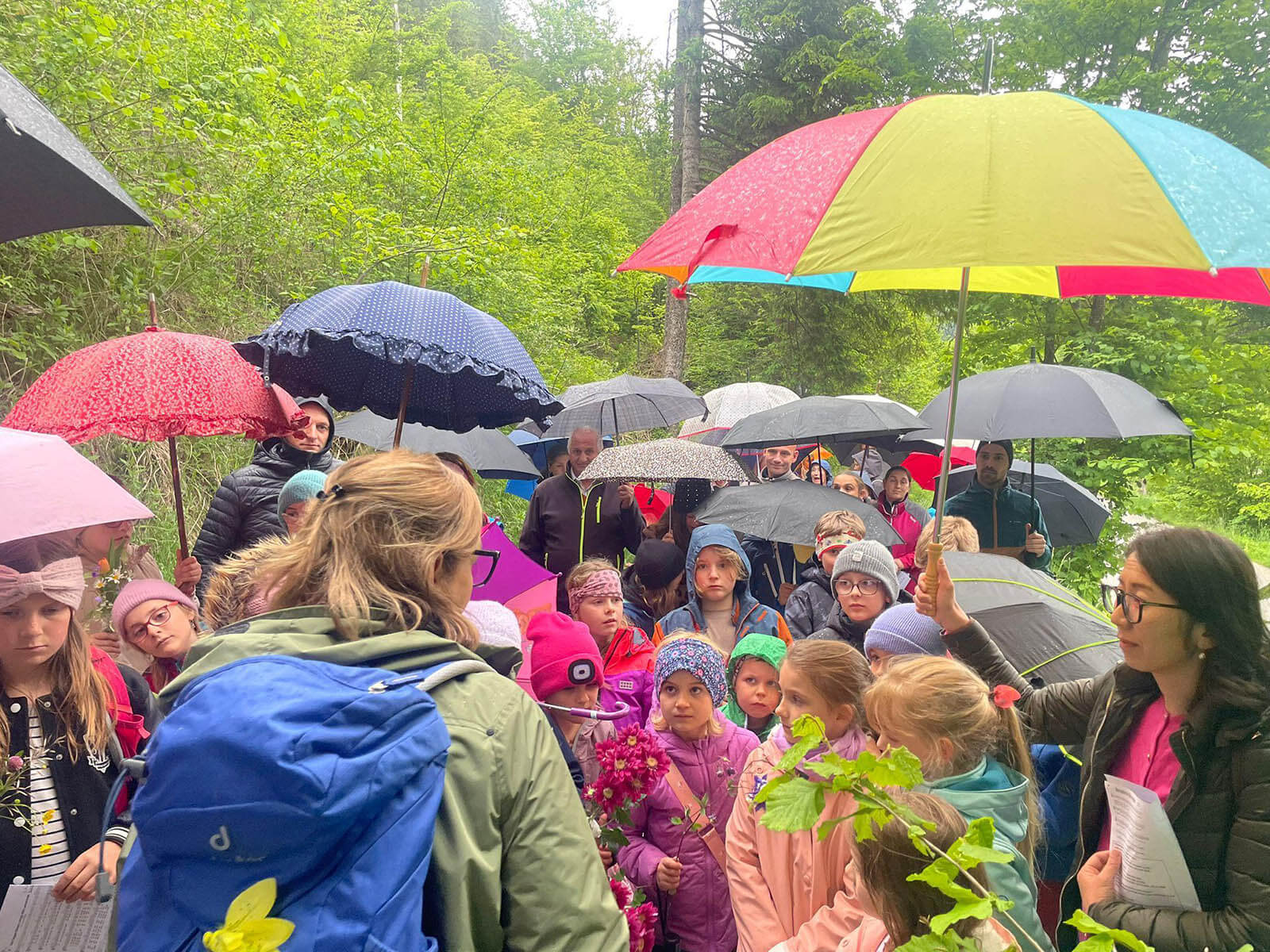 Zu Beginn erklärte Pfarrer Frauenlob den Kindern, warum Menschen sich zu einer Wallfahrt auf den Weg machen und was das für die Menschen bedeutet. Bei einer Wallfahrt gehen oder reisen Menschen zu einer Kirche oder einem Ort, der z. B. Maria gewidmet ist. Weil sie an sie glauben und sie um Hilfe, Schutz oder den Segen bitten möchten. Nach dem Kreuzzeichen und einem gemeinsamen Gebet machten sich nun alle zusammen mit einem Marienlied singend auf den Weg zur Kirche Maria am Berg.
