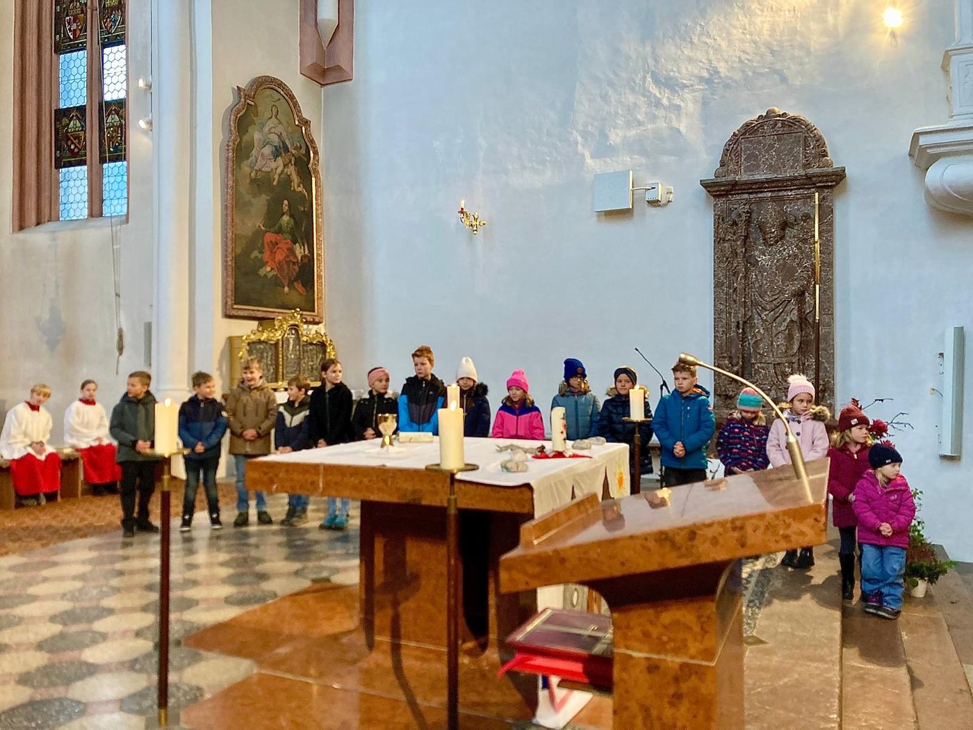 Am Christkönigssonntag, dem letzten Tag im Kirchenjahr, begann für die 30 Erstkommunionkinder in St. Andreas die Vorbereitungszeit auf ihre Hl. Erstkommunion. Am 1. Advent, dem Beginn des neuen Kirchenjahres, startete diese für alle 13 Erstkommunionkinder in der Pfarrei Hl. Familie Au. Gemeinsam mit den Verantwortlichen Pfarrer Dr. Thomas Frauenlob, Diakon Michael König und der Religionslehrerin Kathi Stangassinger feierten und gestalteten die Kinder die feierlichen Gottesdienste in vielfältiger Weise. Sie lasen Kyrie-Sätze, Fürbitten, sangen kräftig bei den Liedern mit, bei denen Musiklehrerin Simone Resch einige selbst komponiert hat.