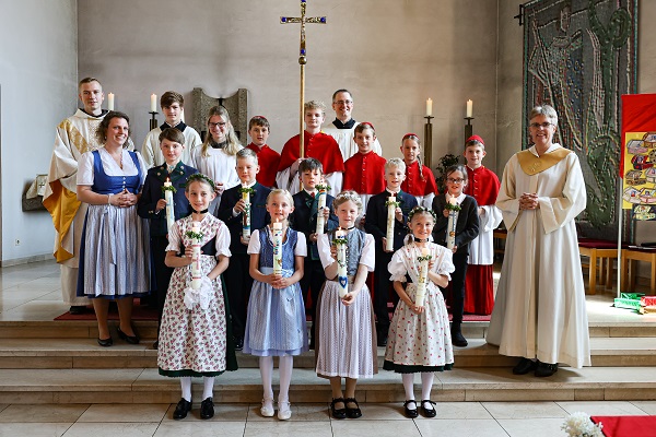 Nach dem feierlichen Einzug mit den Ministranten und dem Zelebranten durfte jedes Kind an der Osterkerze seine selbst verzierte Erstkommunion-kerze entzünden. Nach dem liturgischen Gruß durch Pater Fidelis und einleitenden Worten der Gemeindereferentin Birgit Hauber übernahmen die Kinder die Kyrierufe und stimmten dann in den Gloriagesang ein. Der Pfarrverbandschor unter Leitung von Angela Hanke gestaltete den Gottesdienst mit modernen Liedern, die mit den Kindern im Rahmen des Religionsunterrichts gut geübt worden waren.