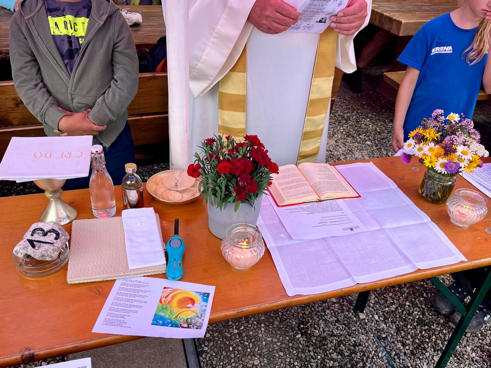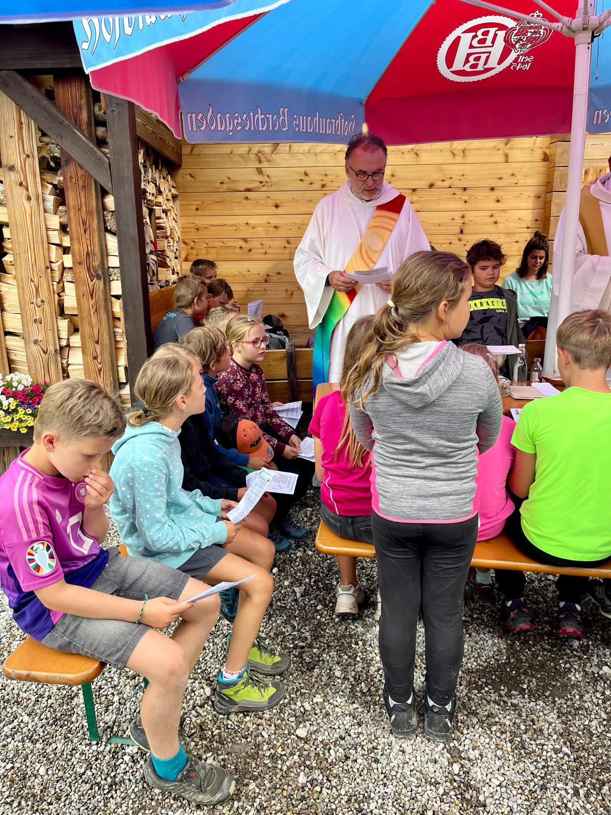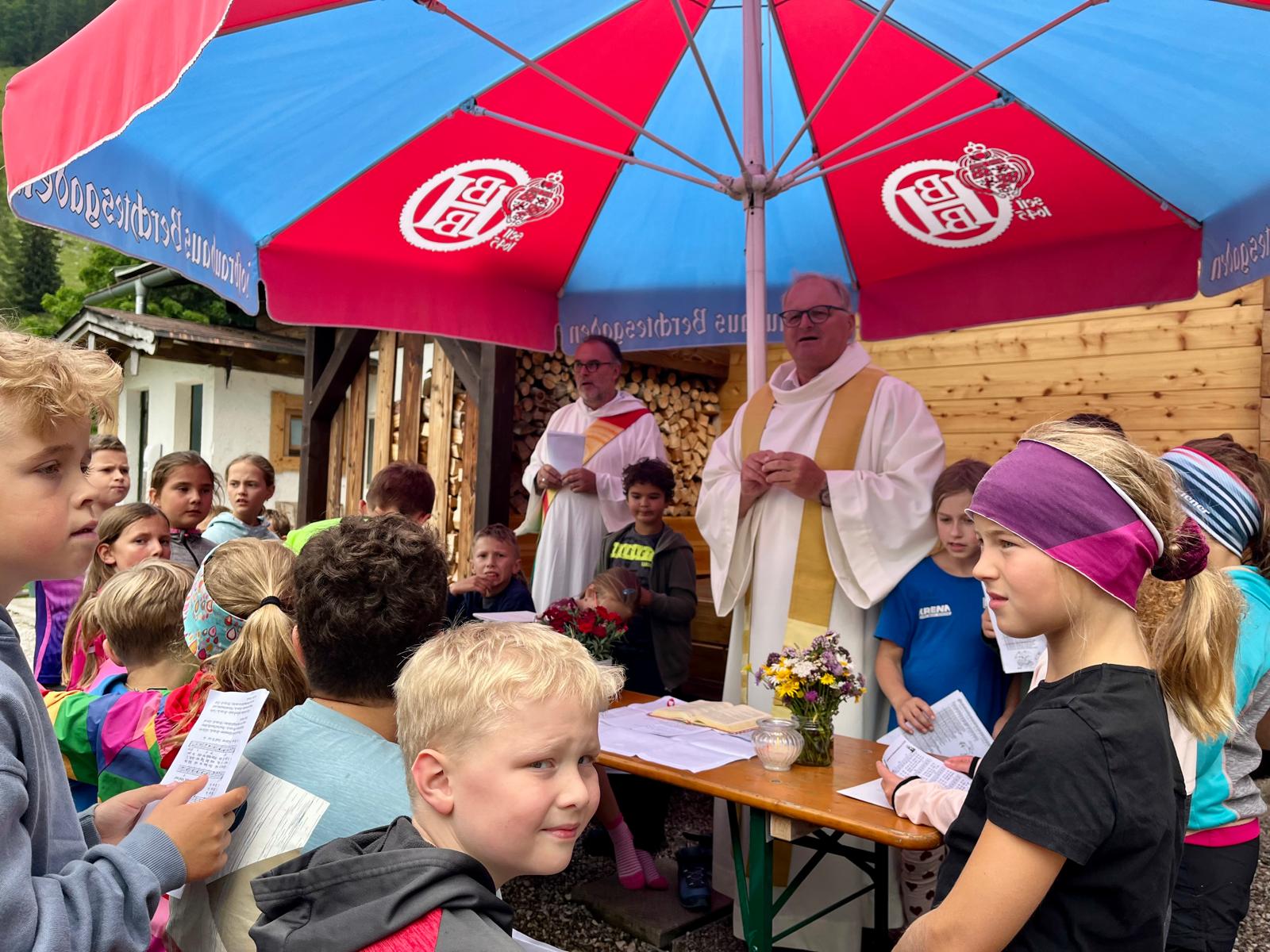 Nachdem sich alle um Pfarrer Thomas Frauenlob und Diakon Michael König zum Gottesdienst versammelt hatten, die Kinder den Altar mit einem Almblumenstrauß und Kerzen geschmückt hatten, kam ein kurzer Regenschauer.