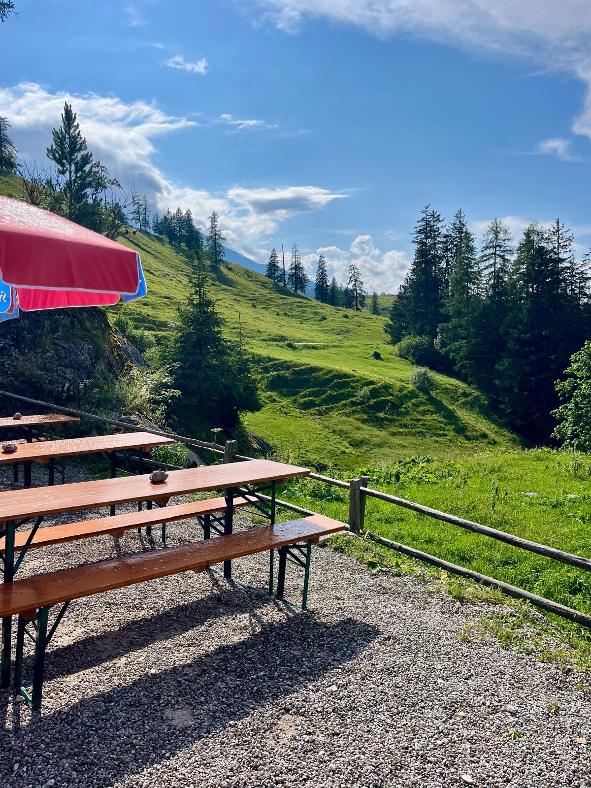Nach dem Gottesdienst gab es dann endlich die wohlverdiente Brotzeit für alle. Für die Kinder hatte Familie Renoth Würstel und leckeren Schokoladenkuchen hergerichtet, worüber sich die Kinder sehr freuten und alles verspeisten. Frau Pflug hatte die Getränke mitgebracht. Alle bedankten sich für diesen tollen Ausflug auf die Alm und die gute Brotzeit.