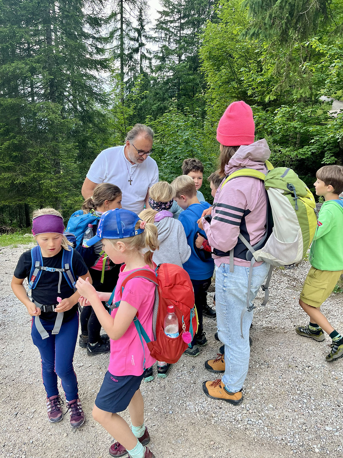 Schon seit Wochen geplant war dieser Kommunionausflug und wir alle freuten uns schon darauf. Aber fast wäre er wortwörtlich „ins Wasser gefallen“. Schlecht war die Wetterprognose für die ganze Woche gemeldet und man musste sich schon mit dem Gedanken für ein Alternativprogramm auseinandersetzen. Doch das Wetter meinte es am Tag des Ausflugs gut und man traf sich gegen 14 Uhr am Parkplatz Hinterbrand. Gemeinsam mit Pfarrer Dr. Thomas Frauenlob, Diakon Michael König, den Kommunionkindern begleitet von zahlreichen Eltern und ihrer Religionslehrerin Kathi Stangassinger machten sich alle, nach einem kurzen Gebet, auf den Weg zur Königsbachalm. Auf dem Weg dorthin machte man immer wieder kleine Stationen, bei denen die Kinder sich mit den Inhalten des Sonnengesanges, des heiligen Franziskus von Assisi, auseinandersetzten und über deren Bedeutung nachdachten und sich dazu äußerten. Was den Kindern, in der schönen Natur die sie umgab, sehr leicht fiel.