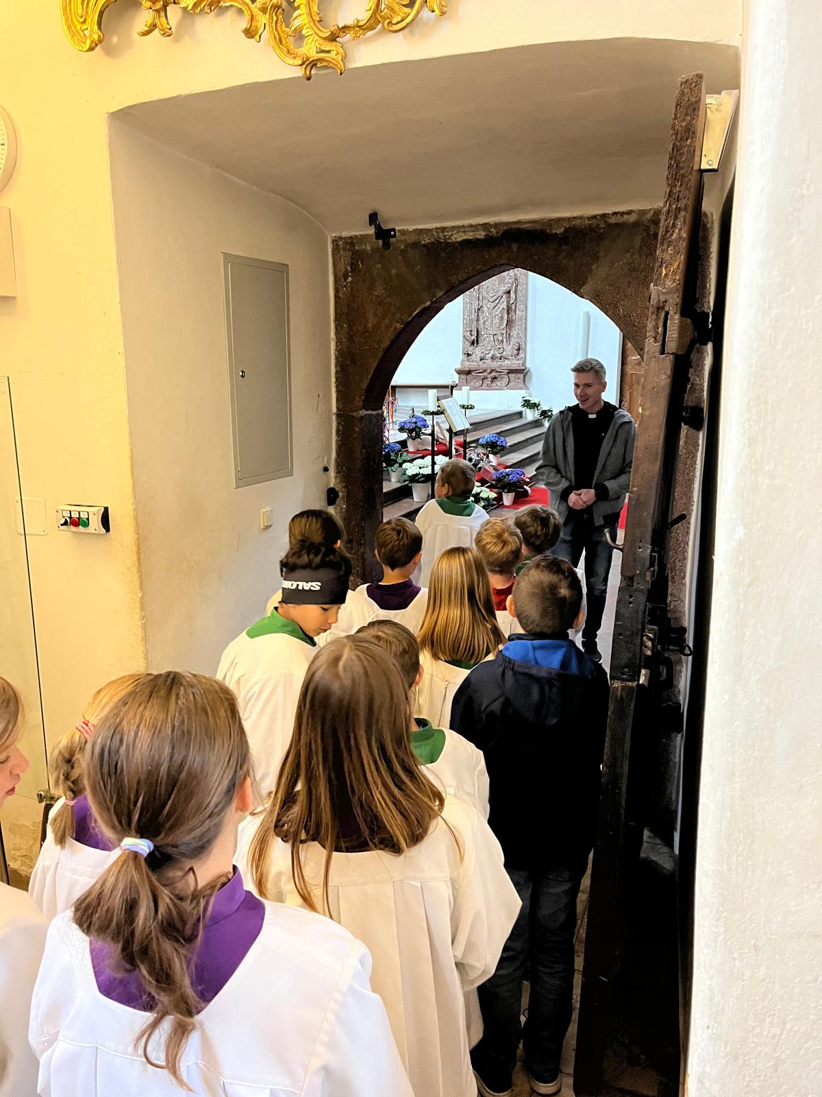 Voller Spannung stellten sich danach alle in der Sakristei zum Einzug auf und man übte gemeinsam, wie dieser abläuft. Die Kinder waren mit Eifer und Begeisterung dabei. Aus diesem Erleben, wie sich ministrieren anfühlt, waren viele Kinder so begeistert, dass sie sehr gerne zum Ministrieren beginnen