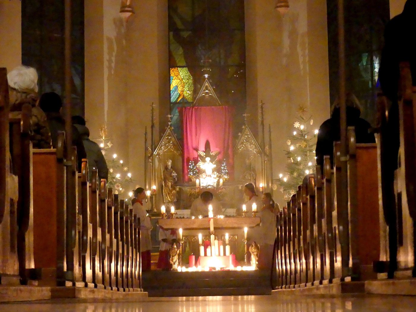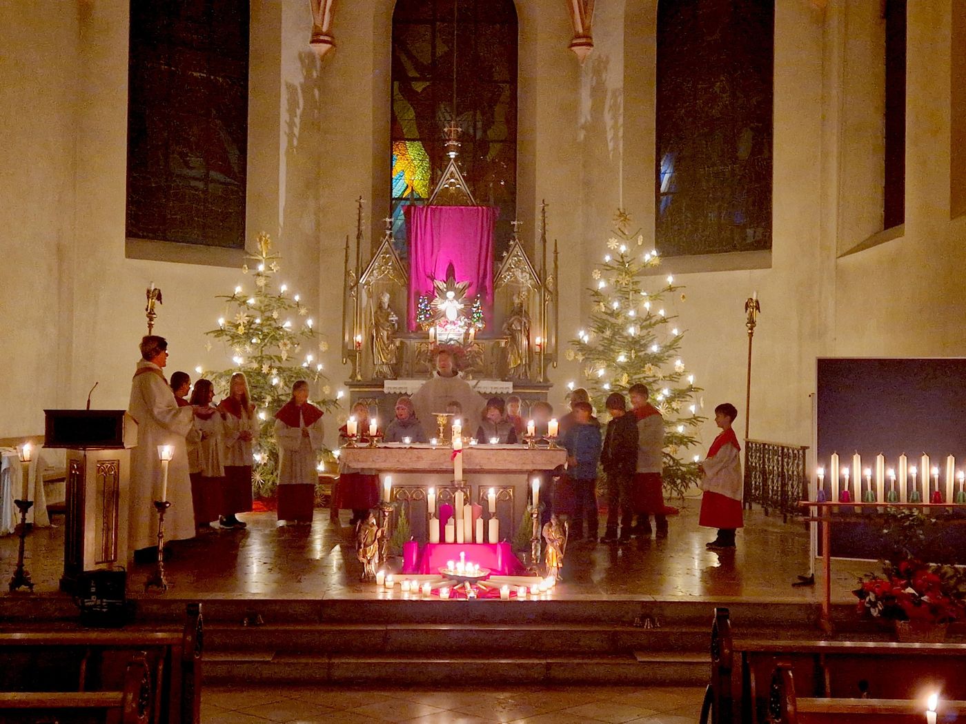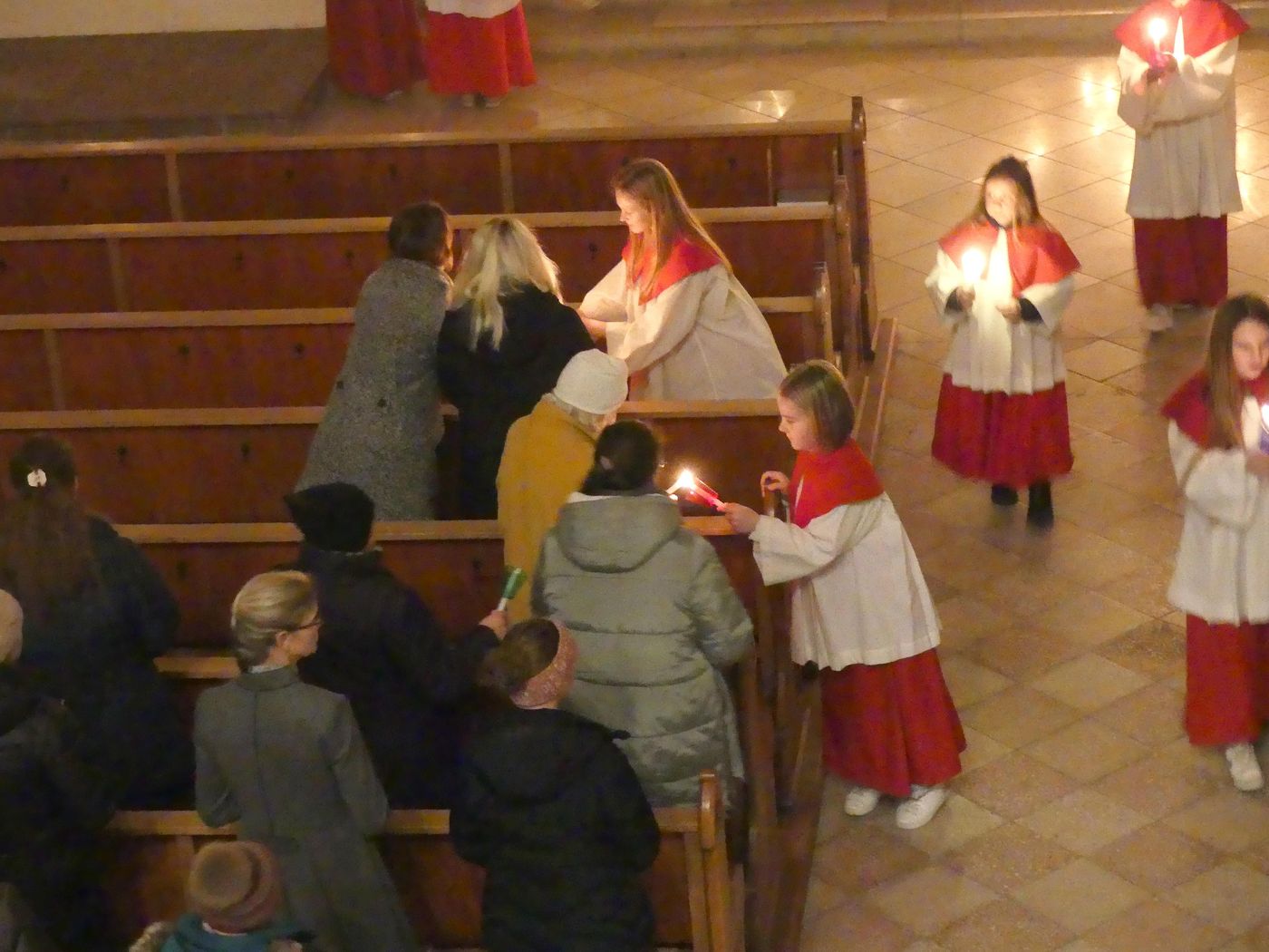 Nach der Kerzensegnung wurden noch in der Kirche die Kerzen der Gläubigen mit Unterstützung der Ministrantinnen entzündet. Dann formierte sich der Zug und bewegte sich um den oberen Markt, um dann wieder in das Gotteshaus einzuziehen. Dort wurde gemeinsam der Festgottesdienst gefeiert. Vorne in der ersten Bank hatten die diesjährigen Kommunion-kinder Platz genommen, die die geweihten Kommunionskerzen in Empfang nehmen konnten, um sie später persönlich nach ihrem Geschmack zu verzieren und um sie am Tage der Erstkommunion zu dem hohen Ereignis zu tragen..