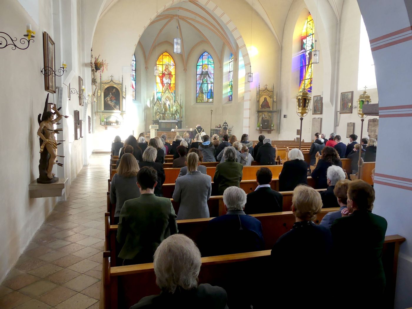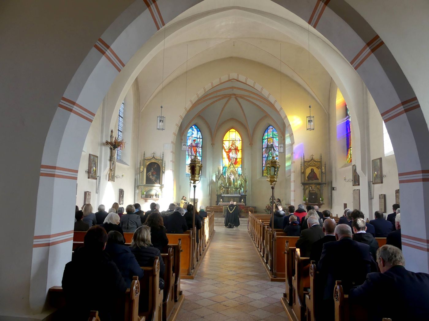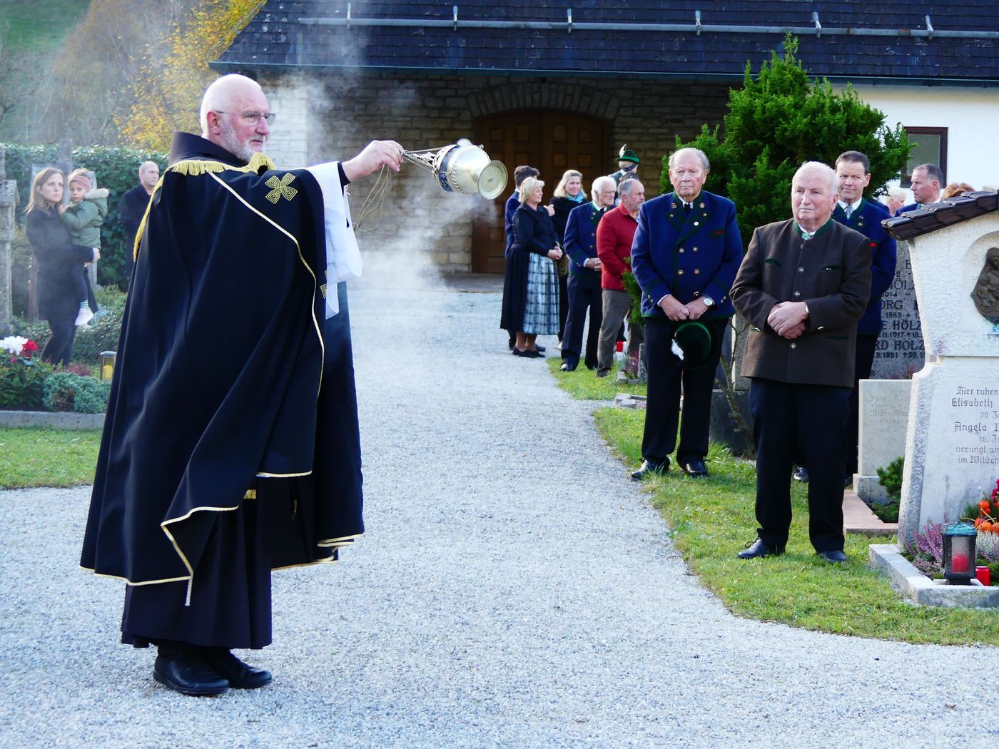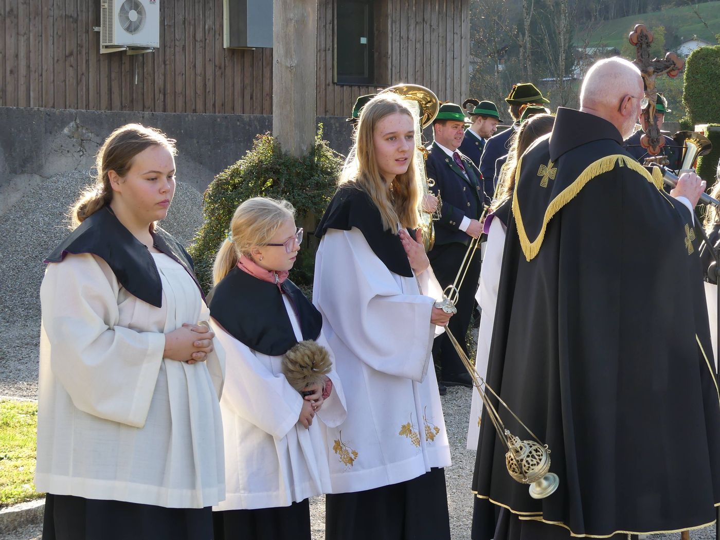 Viele Gläubige der Gemeinde fanden sich daher zunächst in der Pfarrkirche ein, um dabei der in diesem Jahr in der Pfarrgemeinde verstorbenen Personen zu gedenken. Pater Manfred Gruber rief die Namen der 10 heuer Verstorbenen nochmals in Erinnerung und für jeden wurde am Altar eine Kerze angezündet. Danach ging es in einem gemeinsamen Kirchenzug, der von den Ministrantinnen angeführt wurde, zum Friedhof.