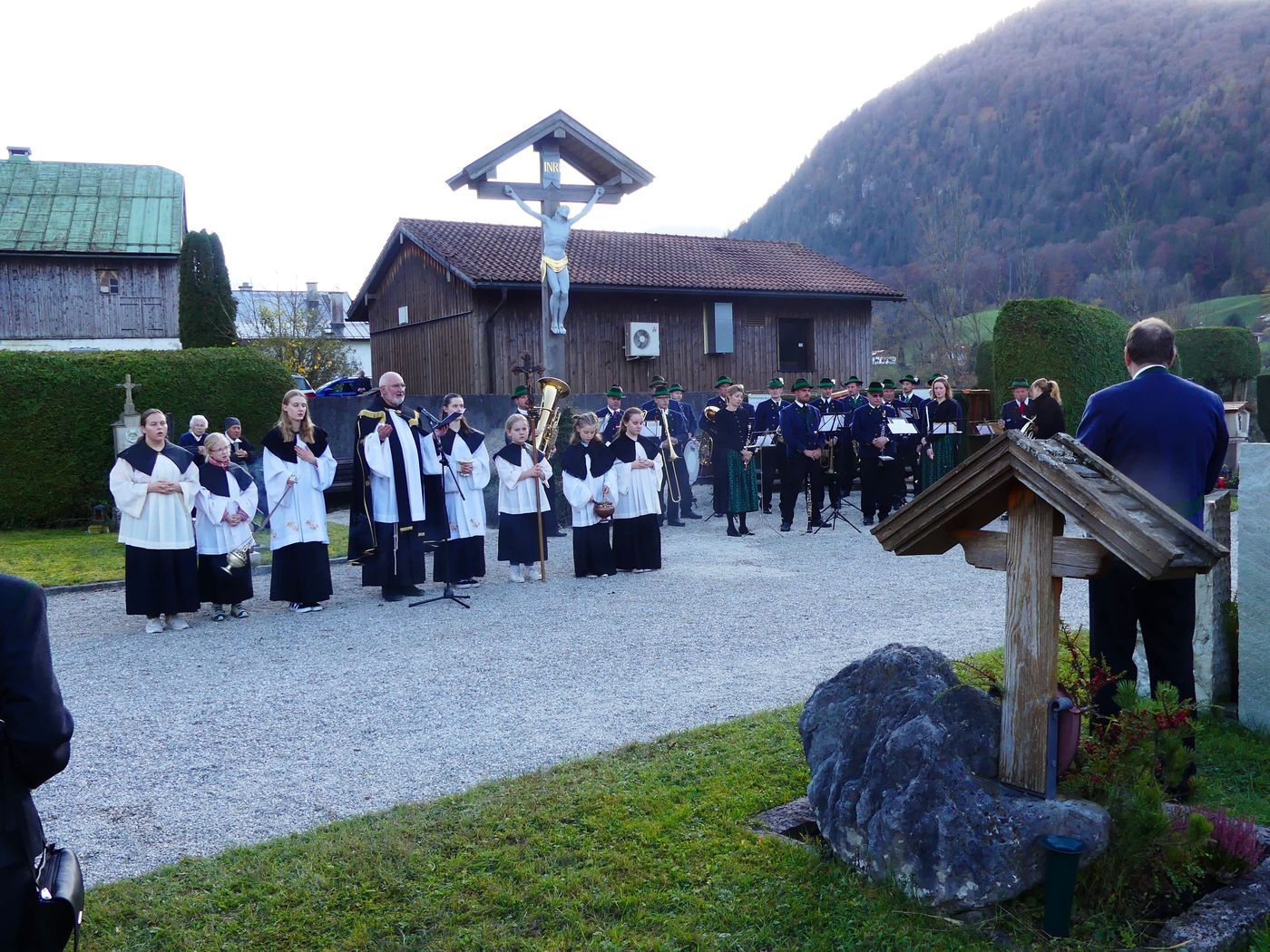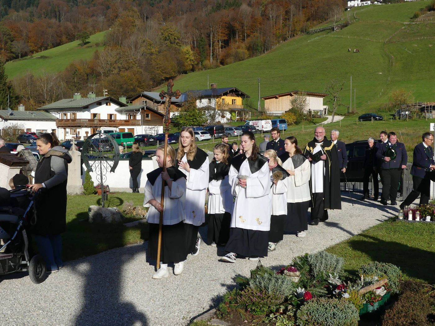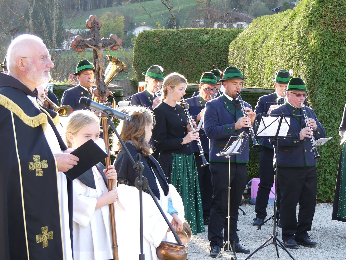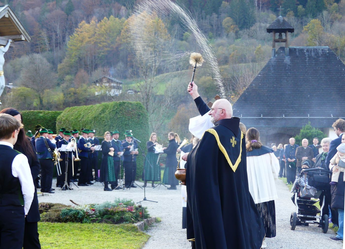Die traditionelle Gräbersegnung mit Weihwasser und Weihrauch wurde von der Musikkapelle Marktschellenberg unter der Stabführung der Franziska Aschauer musikalisch umrahmt. Nach der Gräbersegnung erklang das Lied vom guten Kameraden, das von 3 Salutschüssen des Weihnachtsschützenvereins Götschen-Schellenberg begleitet wurde. Zum Abschluss bedankte sich Pater Manfred bei Allen, die zur Organisation des Festtages beigetragen hatten und entließ die Gläubigen mit allen guten Wünschen für den Rest des Feiertages und so manch einer nutzte nach dem Friedhofsbesuch die Gelegenheit zu einem Gespräch mit Bekannten, die man schon lange nicht mehr gesehen hatte.