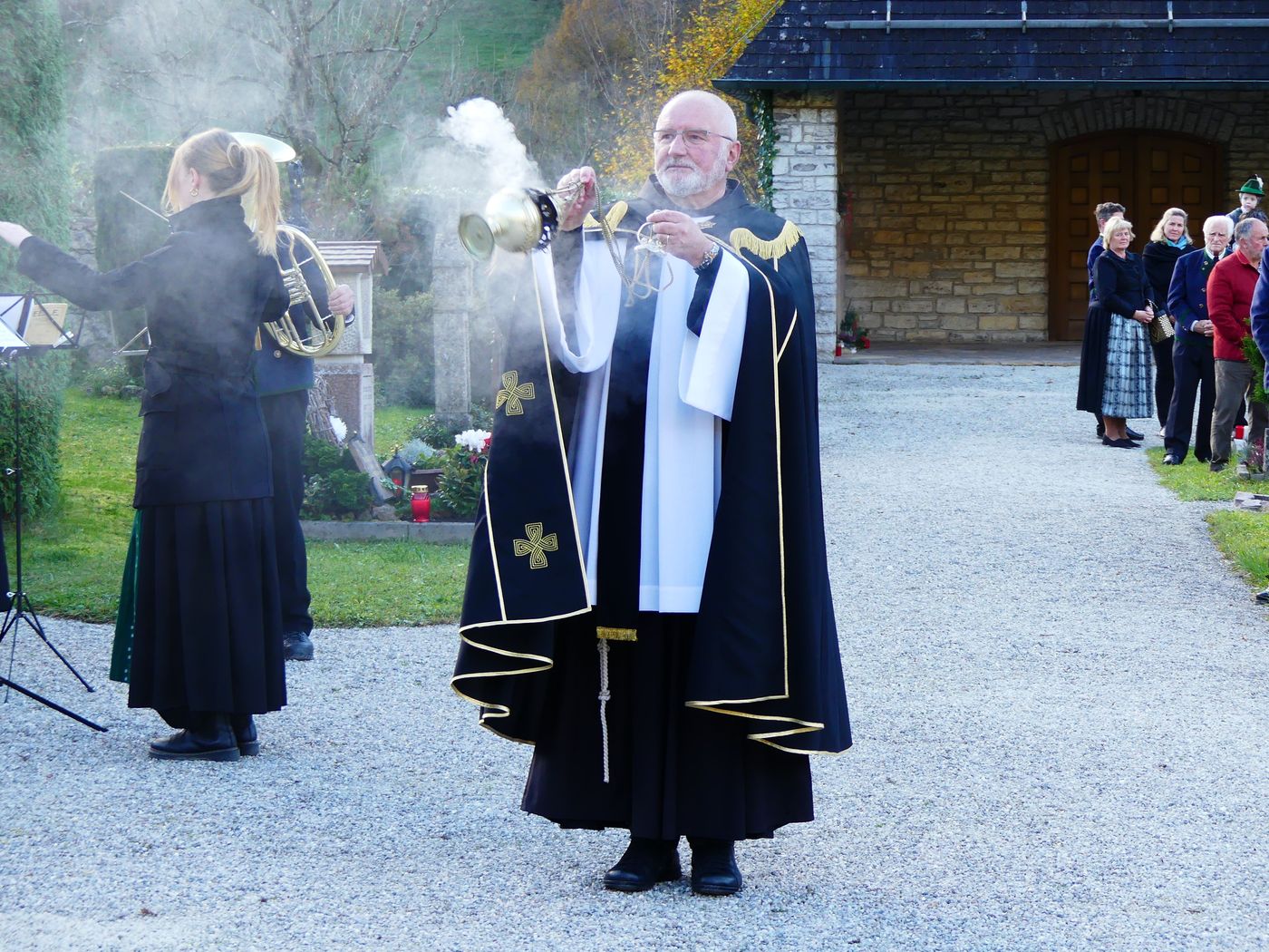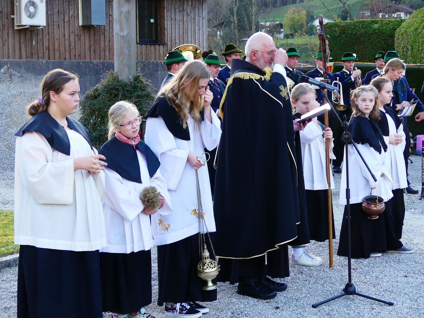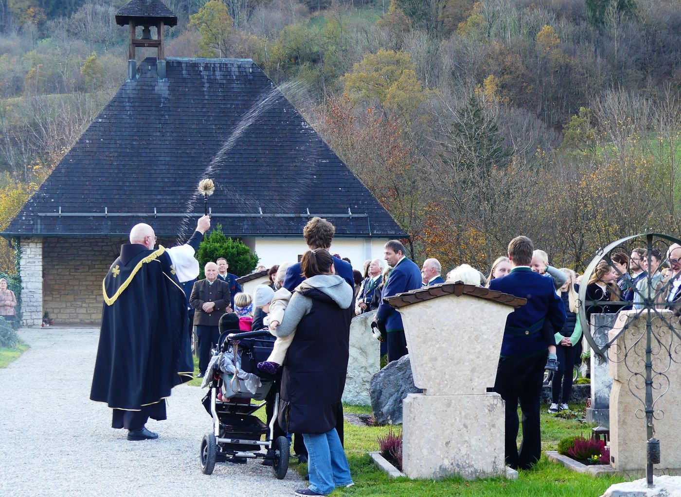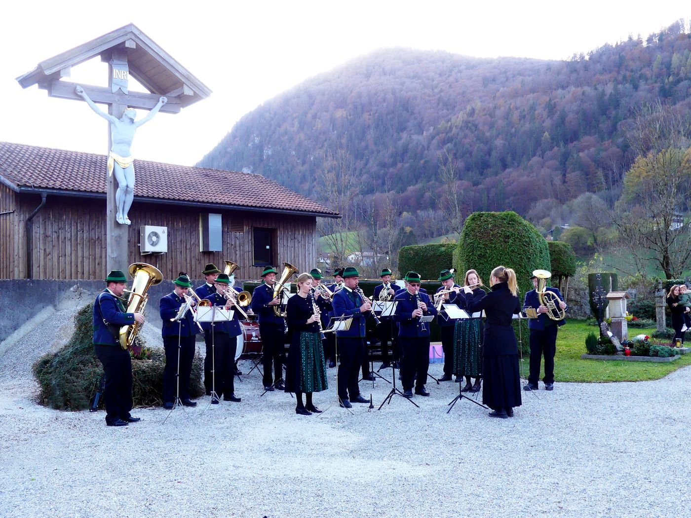 Die traditionelle Gräbersegnung mit Weihwasser und Weihrauch wurde von der Musikkapelle Marktschellenberg unter der Stabführung der Franziska Aschauer musikalisch umrahmt. Nach der Gräbersegnung erklang das Lied vom guten Kameraden, das von 3 Salutschüssen des Weihnachtsschützenvereins Götschen-Schellenberg begleitet wurde. Zum Abschluss bedankte sich Pater Manfred bei Allen, die zur Organisation des Festtages beigetragen hatten und entließ die Gläubigen mit allen guten Wünschen für den Rest des Feiertages und so manch einer nutzte nach dem Friedhofsbesuch die Gelegenheit zu einem Gespräch mit Bekannten, die man schon lange nicht mehr gesehen hatte.