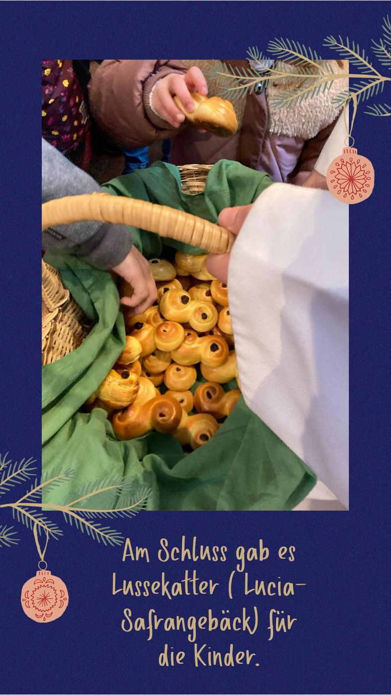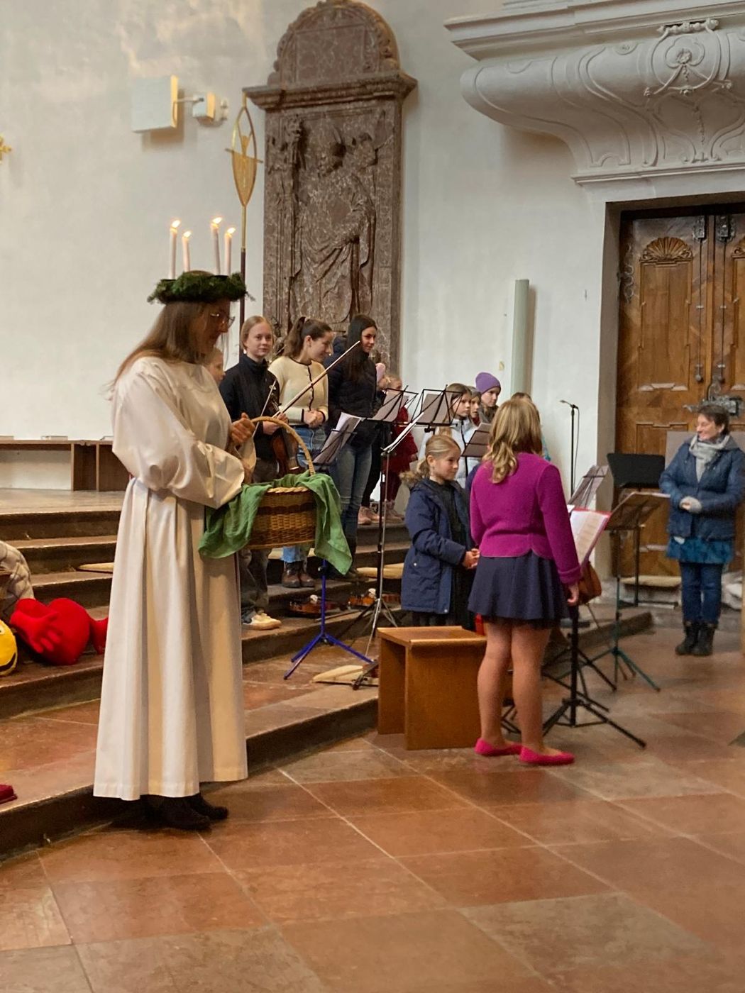 Nach dem Segen zog dann „Lucia“ mit einem weißen Kleid mit rotem Gürtel und dem brennenden Kerzenkranz von hinten in die Stiftskirche hinein und nicht nur die Kinder staunten sehr. Sie hatte auch einen Korb dabei, so wie es in der Legende beschrieben steht. Die verkleidete Lucia erzählte im Gottesdienst, dass sie das Licht von Jesus zu allen heute bringen möchte und die Herzen aller Menschen im Gottesdienst damit erleuchten möchte. Sie erzählte auch, dass sie allen Freude schenken möchte, deshalb hat sie einen Korb mit den Lysekatter-Lucia-Broten dabei, die in Schweden immer am Lucia-Tag verschenkt und gegessen werden. Lucia erzählte „Und durch das gemeinsame Teilen der Lucia-Brote, wollen auch wir einander Liebe schenken. Denn mit unserer Liebe kann die Welt ein wenig friedlicher werden, das ist unsere Hoffnung.“ Die Kinder ließen sich das Safrangebäck schmecken und teilten es miteinander, so wie Lucia damals vor vielen hundert Jahren mit den verfolgten Christen Licht, Liebe, Wärme und Freude geteilt hat.