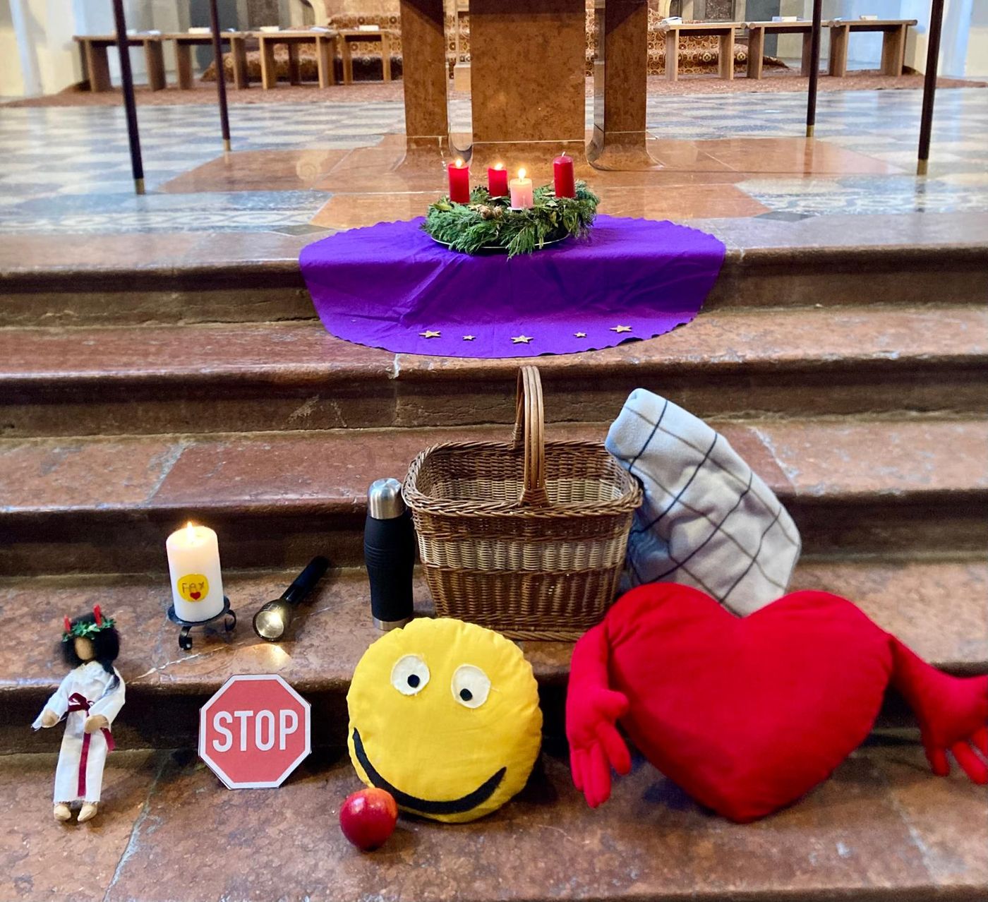 Viele Gegenstände, die mit der Geschichte rund um die heilige Lucia in Zusammenhang stehen, waren in den vorderen Kirchenbänken bei den Kindern versteckt. Die Kinder durften die gefundenen Sachen nach vorne bringen, herzeigen und überlegen, was der Gegenstand anhand der Geschichte bedeuten könnte. Sie brachten ein Herz, einen Smiley, ein Brot, einen Apfel, eine Thermoskanne, eine Kerze, eine Taschenlampe, ein Stopp-Schild, eine Decke und eine Lucia-Figur.