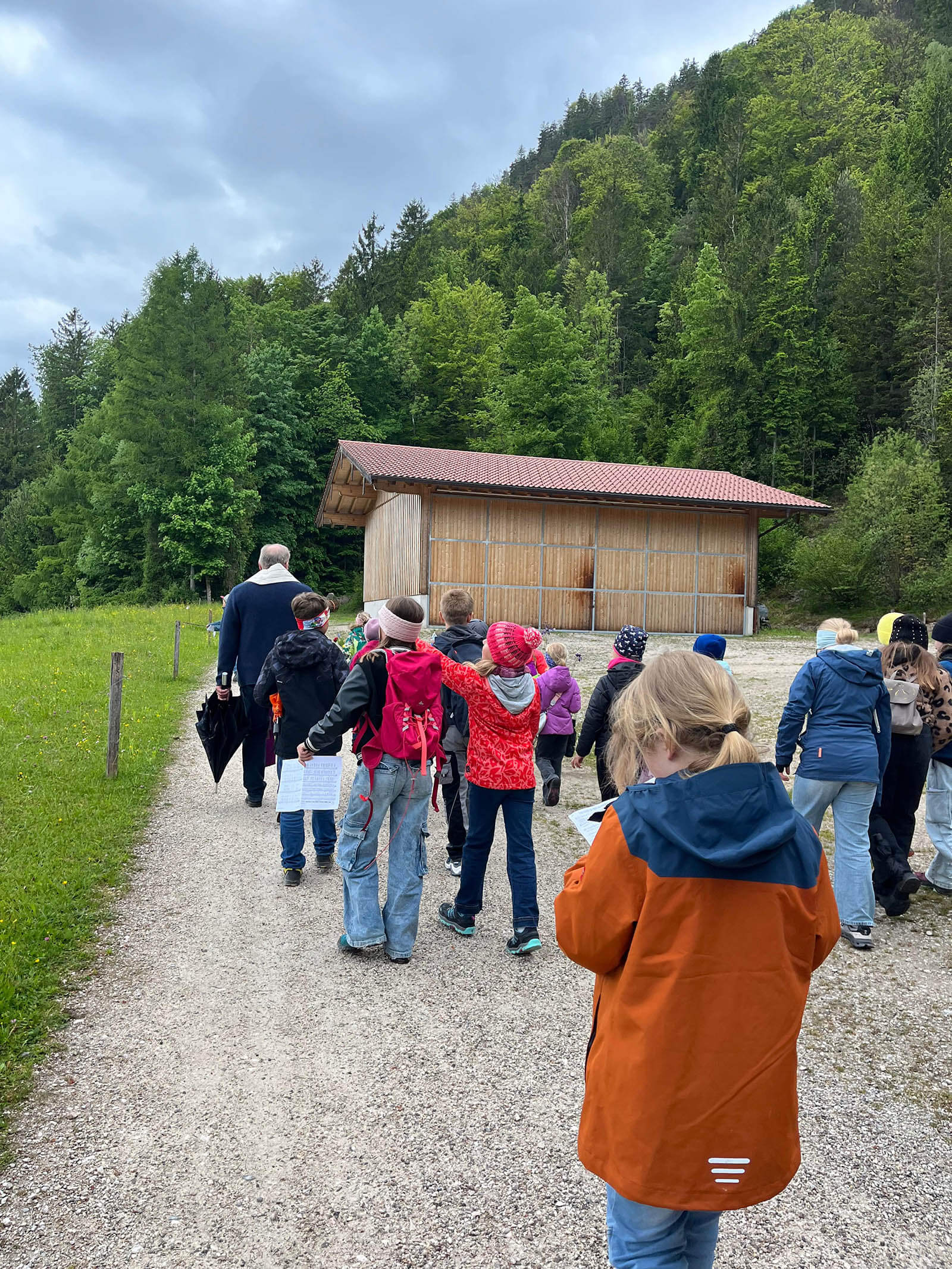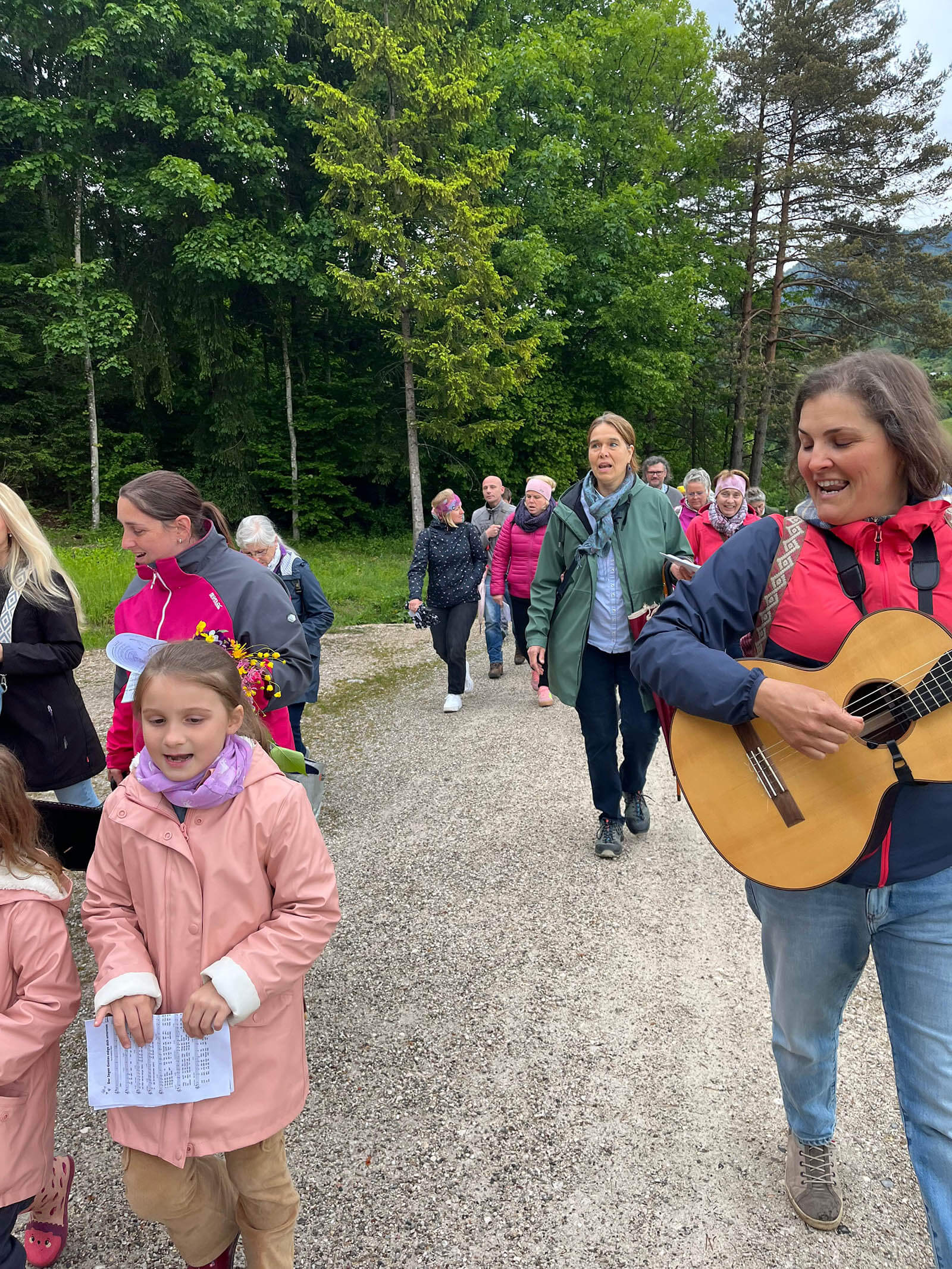 Zu Beginn erklärte Pfarrer Frauenlob den Kindern, warum Menschen sich zu einer Wallfahrt auf den Weg machen und was das für die Menschen bedeutet. Bei einer Wallfahrt gehen oder reisen Menschen zu einer Kirche oder einem Ort, der z. B. Maria gewidmet ist. Weil sie an sie glauben und sie um Hilfe, Schutz oder den Segen bitten möchten. Nach dem Kreuzzeichen und einem gemeinsamen Gebet machten sich nun alle zusammen mit einem Marienlied singend auf den Weg zur Kirche Maria am Berg.