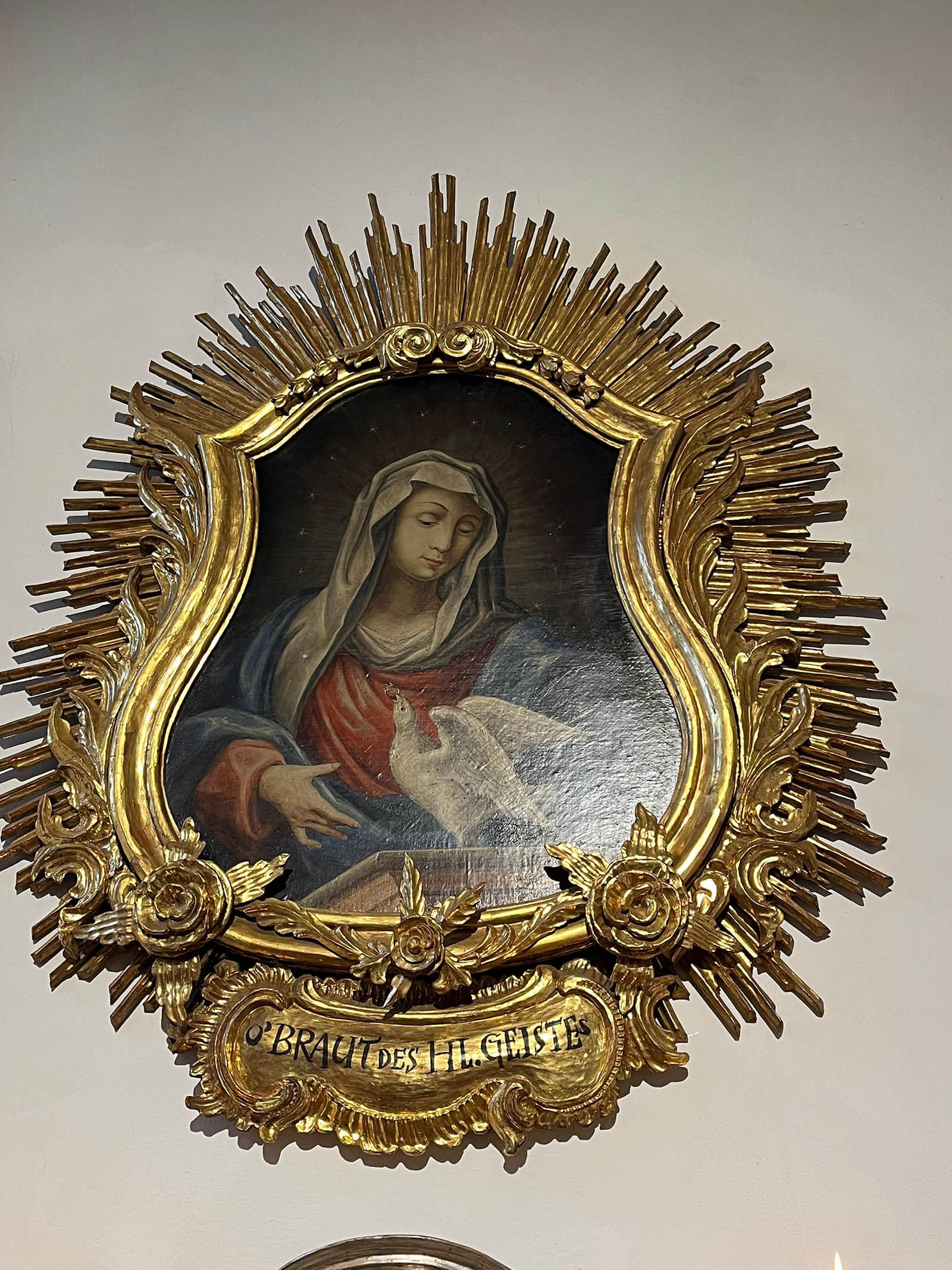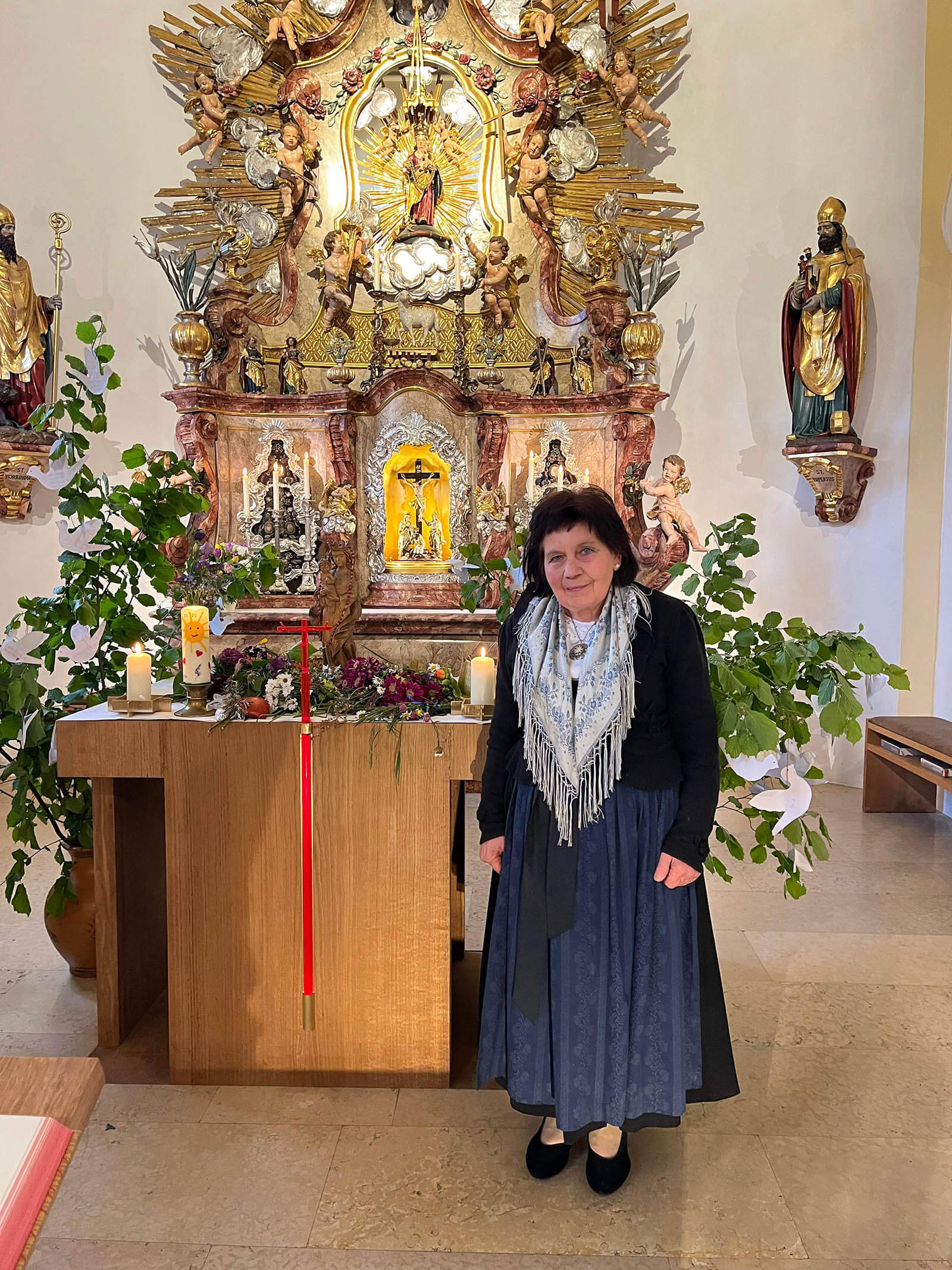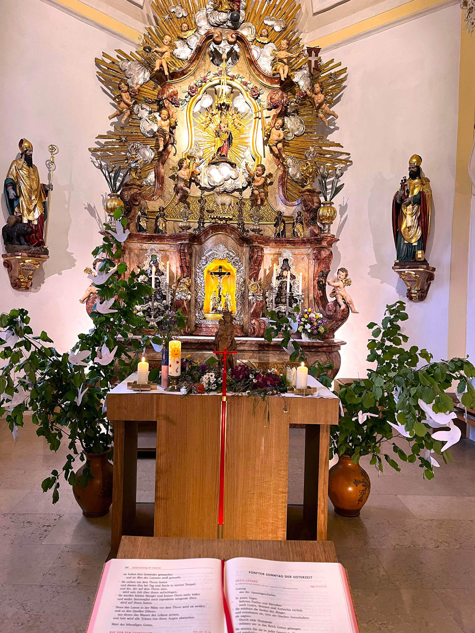 Im Anschluss feierten alle gemeinsam eine schöne Maiandacht, welche die Kinder ganz viel mitgestalten durften. In der Maiandacht erfuhren die Kinder viel über die Taube als Friedenssymbol. Auch staunten sie über das Bild von Maria mit der Taube, das sie in der Kirche entdecken konnten. Der Kinderchor sang mit allen gemeinsam freudig verschiedene Marienlieder. Die Kinder durften die Marienfigur in die Mitte auf den Altar stellen. Pfarrer Frauenlob bat die Kinder, dass sie nun die Maria mit all ihren mitgebrachten Blumen schmücken dürfen, so entstand ein wunderschönes Altarbild mit „Maria in der Blumenwiese“.