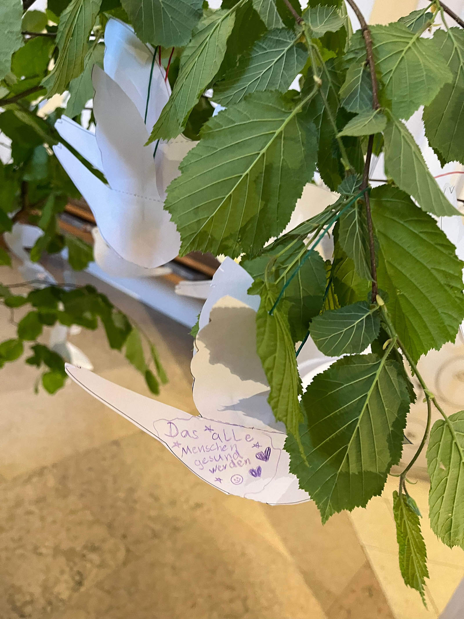 Danach durften die Kinder ihre Gegenstände dazulegen, die sie unterwegs gesammelt hatten, Herz, Krone und Blume und kurz erzählen, was sie bedeuten. Er erinnerte alle nochmal kurz daran, weshalb man sich auf den Weg zu dieser Wallfahrt gemacht habe, nämlich um Maria für den Frieden zu bitten. Anschließend beteten alle gemeinsam ein Friedensgebet zu Maria, der Königin des Friedens. Hier ein kleiner Auszug:“ Liebe Maria, Königin des Friedens, bitte hilf uns, freundlich und liebevoll zueinander zu sein. Schenke uns Frieden in unseren Herzen und in die Welt. Maria bitte bete für uns, damit wir immer friedlich miteinander leben….“. Nach einem gemeinsamen Friedenslied duften alle ihre Friedenstauben an Zweigen neben dem Altar hängen und wer mochte, durfte seinen Friedenswunsch laut vorlesen.