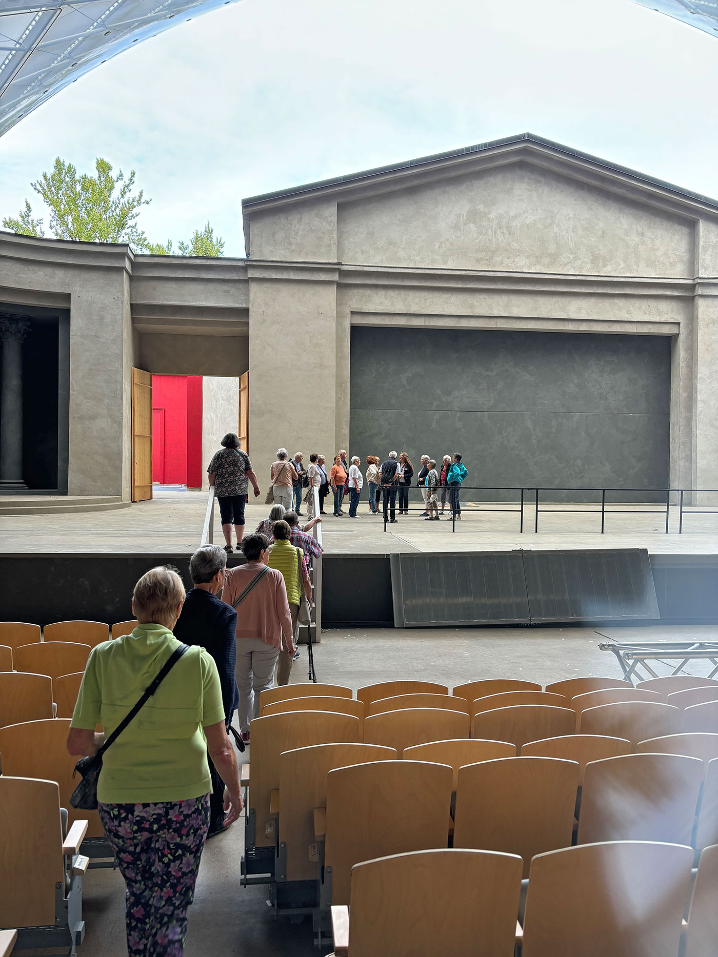 P. Virgil, Pfarrer der kleinen Pfarrgemeinde Ettal, rund um das Klosterareal, stammt aus Freilassing und führte die Gruppe in die Bildersprache unter und im „Ettaler Heiligenhimmel“, der sich als Kuppel der Basilika mächtig über dem Kirchenschiff erhebt. Die Blicke hinter die Kirchenmauern in die kunstreiche Sakristei, das festliche Treppenhaus und den darüberliegenden Kapitelsaal waren Räumlichkeiten, die nicht jeder aufsuchen darf. Am nächsten Tag machte sich die Gruppe vom klostereigenen Hotel, das den Namen des Klosterstifters „Ludwig der Bayer“ trägt, auf nach Oberammergau. Das kleine Dorf, unscheinbar am Beginn des Ammertales gelegen, ist durch das seit 1683 aufgeführte Passionsspiel weltweit bekannt. Viele der Reiseteilnehmer waren schon im alle zehn Jahre stattfindenden Passionsspiel und wohnten der eindrucksvollen Darstellung des Leidens und Sterbens Jesu bei. Geradezu ehrfurchtgebietend war der Blick von der riesigen Bühne in den 4500 Personen fassenden Zuschauerraum, den die Passionsspieler beherrschen müssen. Mindestens ebenso eindrucksvoll der Blick hinter die Kulissen: Die ausgefeilte Bühnentechnik, die so genannten „stehenden Bilder“, Szenen aus dem Alten Testament, mit ihren überdimensionalen Gestaltungselementen. Hinter der eigentlichen Bühne schließlich erhielt die Gruppe von einer engagierten Führerin und – natürlich – Passionsspielerin angesichts vieler Requisiten Einblick in die vielen Überlegungen zur ständigen Überarbeitung des Textes und der Kostüme, die behutsamen Ergänzungen zur Musik aus dem 18. Jahrhundert. Die Massenszenen mit oft mehr als tausend Darstellern, von ganz jungen bis schon betagten Oberammergauern, sind Herausforderungen für Regie und Teilnehmer gleichermaßen. Eindrucksvoll die versteckte Technik, die es braucht, um die Kreuzigungsszene so täuschend echt für die Zuschauer darzustellen. Das Spiel, das viele Menschen aus aller Welt zutiefst berührt und zu Tränen rührt, ist mehr als professionelles Theater, es ist Leidenschaft und Teamwork der Oberammergauer. „Der Passion“, wie die Einheimischen sagen, formt tausende von Mitwirkende zu einer großen, ja hochemotionalen Gemeinschaft.