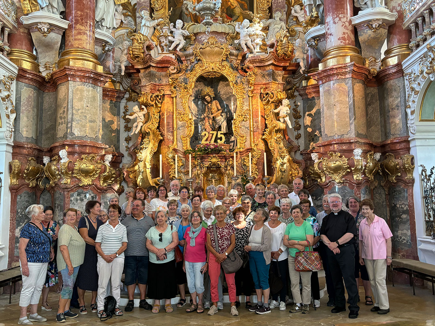 2024 feiert das Chorherrenstift Rottenbuch 950 Jahre seit der Gründung. Es gilt als „Mutterkloster“ des Chorherrenstiftes Berchtesgaden, so dass die Gruppe aus dem Dekanat gleichsam in offizieller Mission als Delegation aus diesem Anlass nach Rottenbuch kam, wie Pfarrer Frauenlob bei seiner Ansprache in der Hl. Messe mit der Gruppe hervorhob. Wenige Fahrminuten entfernt stand der nächste Höhepunkt auf dem Programm. Die Basilika des Hl. Martin in Steingaden. Wiederum eine Gründung des Welfen, mit romanischer Architektursubstanz und der Ausschmückung im Stile des Barock. Der kundige Führer, Herr Berlinger, führte die Gruppe auch an das Grab von Dominikus Zimmermann, den Erbauer der nahegelegenen Wieskirche, das letzte Ziel der Reise.