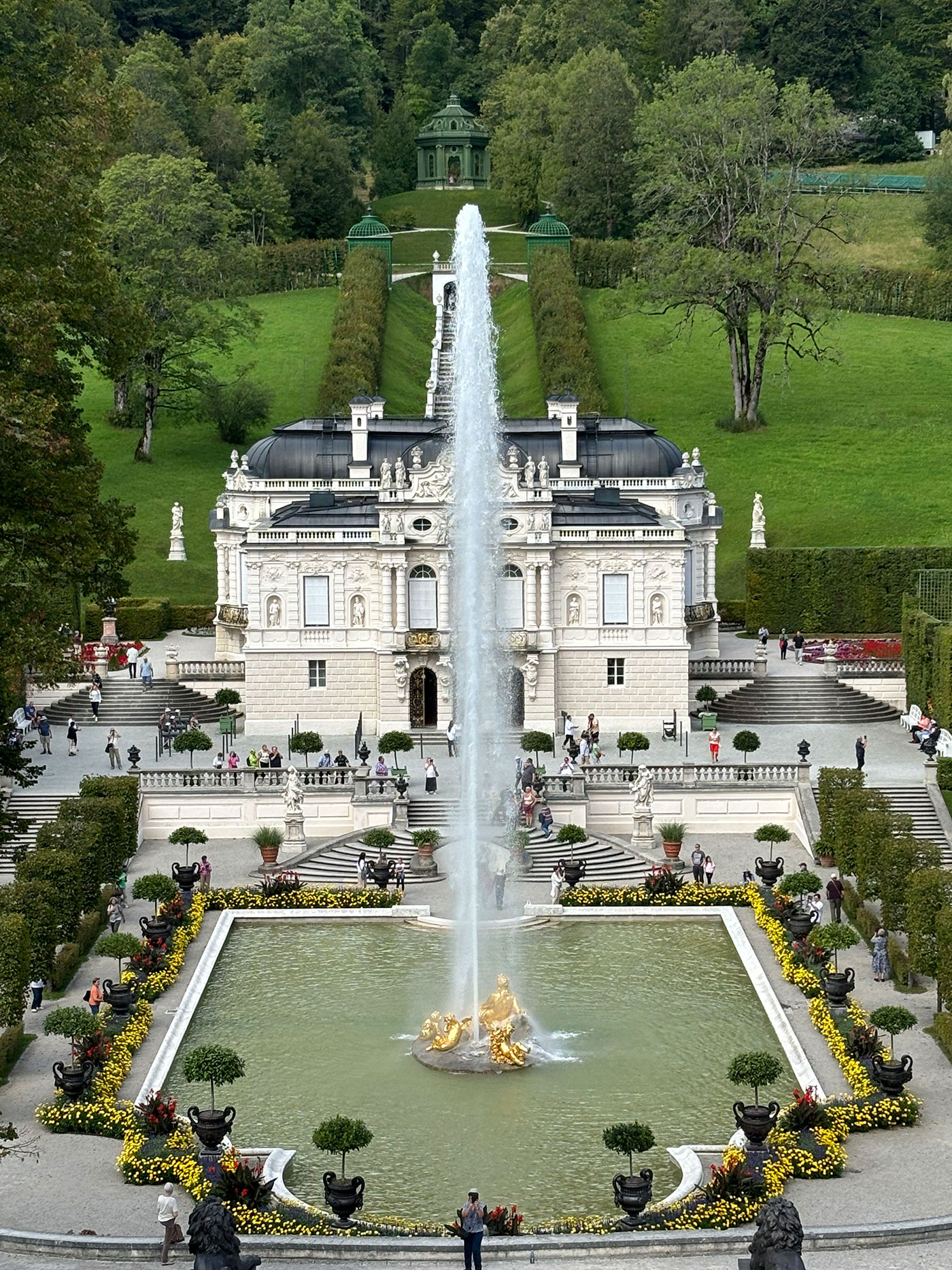 Die einsame Schönheit der Park- und Schlossanlage Linderhof, im nahen Graswangtal bietet geradezu das Kontrastprogramm. König Ludwig II. schuf sich einen prachtvollen Rückzugsort, wo er inspiriert von seinen absolutistischen Vorbildern Frankreichs eine eigene Traumwelt in der Abgeschiedenheit der Berge schuf. Allein die Parkanlage mit der mächtigen Fontäne, die von Zeit zu Zeit einem Geysir gleich ausbricht beeindruckt und begeistert jeden, der Sinn für Gartengestaltung hat. Die üppige Innenausstattung des Schlosses erschien so manchem fast etwas drückend. Eine sehr eigenwillige Welt, wie eben auch der Erbauer selbst war.