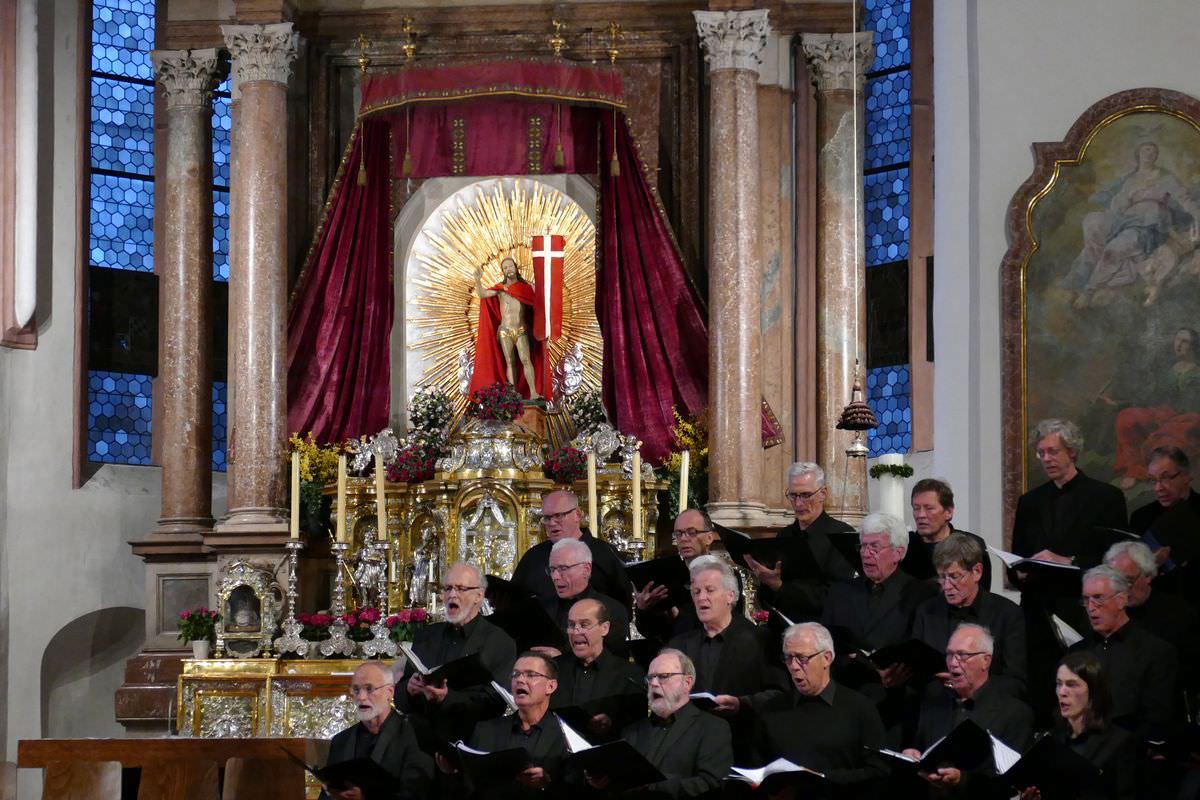 Das dritte dargebotene Werk, das dem Konzertabend seinen Namen gegeben hatte, war „Lux Aurumque“, eine A-cappella-Komposition von Eric Whitacre (geboren 1970 in Nevada). Er vertont darin ein englisches Gedicht, das er zu diesem Zweck ins Lateinische übersetzen ließ: „Licht, warm und schwer wie reines Gold, und die Engel singen sanft für das neugeborne Kind.“ Whitacre entwirft dabei mystische und geradezu sphärische Klangbilder und setzt mit feinen Dissonanzen die unterschiedlichen Farben und Spiegelungen des Lichts in Töne um. „Weltbekannt“ wurde das Stück, weil der Komponist es in der nicht unumstrittenen Aktion „Virtual Choir“ von 185 Sängern aus zwölf Ländern singen ließ, die Videos zusammenfügte und bei Youtube einstellte. So interessant das Ergebnis sein mag, das mittlerweile mehr als 5 Millionen Mal angeklickt wurde, mit Sängern aus Fleisch und Blut in einem so passenden Rahmen wie der Stiftskirche mit dem angestrahlten Auferstandenen über dem glitzernden und funkelnden Silberaltar entfaltet das nur fünf Minuten dauernde Werk eine ungleich beeindruckendere Wirkung.