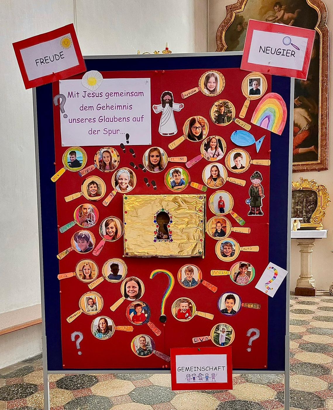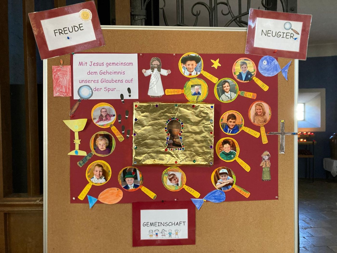 Die Kinder durften sich im Gottesdienst der ganzen Die Kinder sind schon sehr neugierig, was es alles zu entdecken gibt, freuen sich auf das was kommt und auf die gute Gemeinschaft miteinander. Die Kinder durften sich im Gottesdienst der Pfarrgemeinde vorstellen. Außerdem präsentierten die Kinder ihre Vorstellungsplakate. Darauf ist von jedem Kind ein Bild in einer Detektiv-Lupe zu sehen und in der Mitte des Plakates verbirgt sich ein geheimnisvolles goldenes Türschloss, bei dem das Geheimnis dahinter entdeckt werden soll, von den Kommunionkindern und von allen, die neugierig geworden sind.